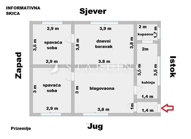 - SUTERENSKOG PROSTORA u kojem se nalazi stan koji se sastoji od: dnevnog boravka, kuhinje, 2 spavaće sobe, pomoćne sobe, kupaonice i izbe.