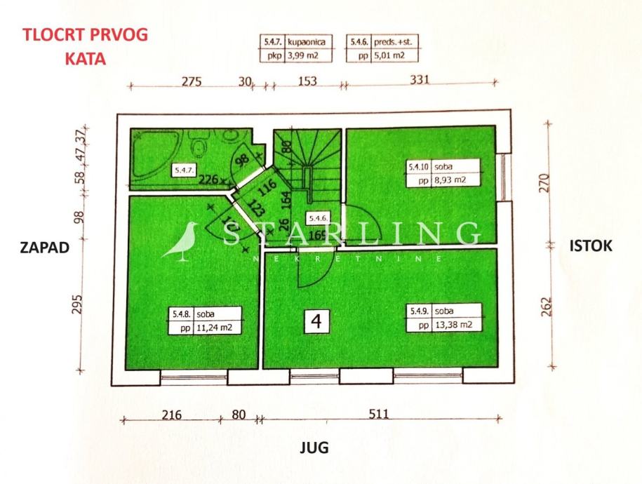 - Prvi kat, površine 43 m2: tri spavaće sobe, kupaonica i hodnik.