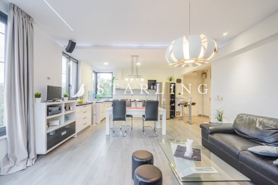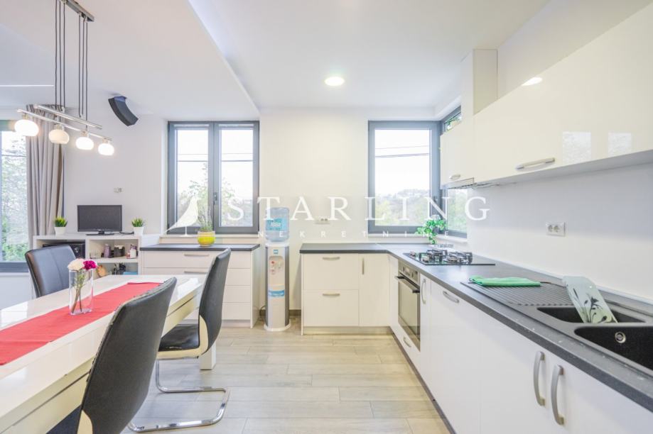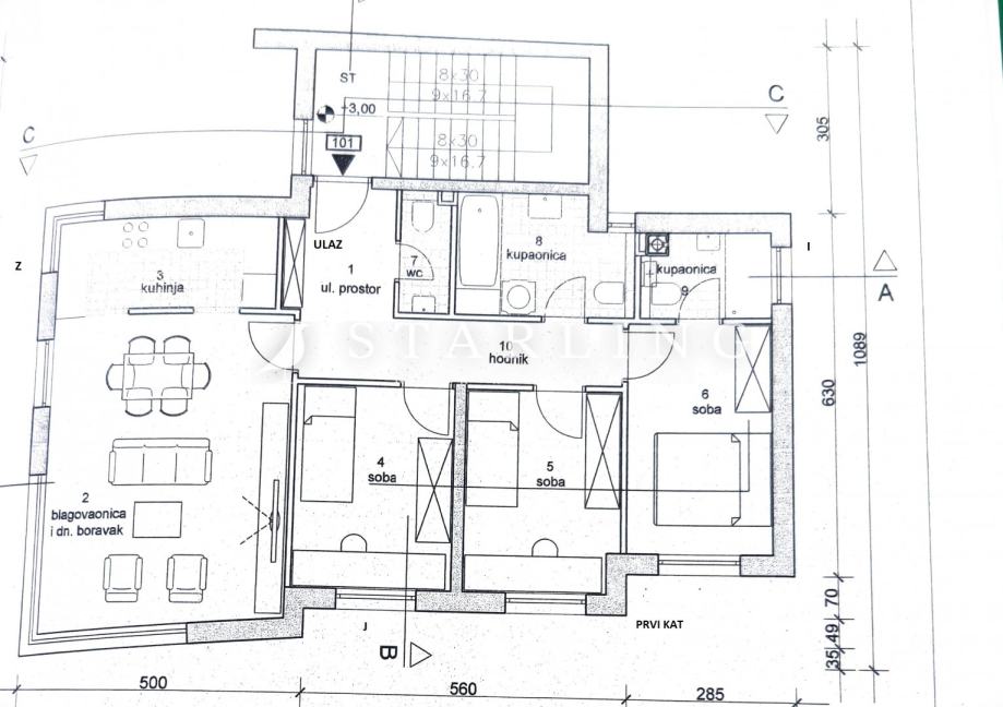 Kat: Dnevnog boravka i kuhinje s blagovanom, tri spavaće sobe, dvije kupaonice, odvojenog wc-a, hodnika i ulaznog prostora