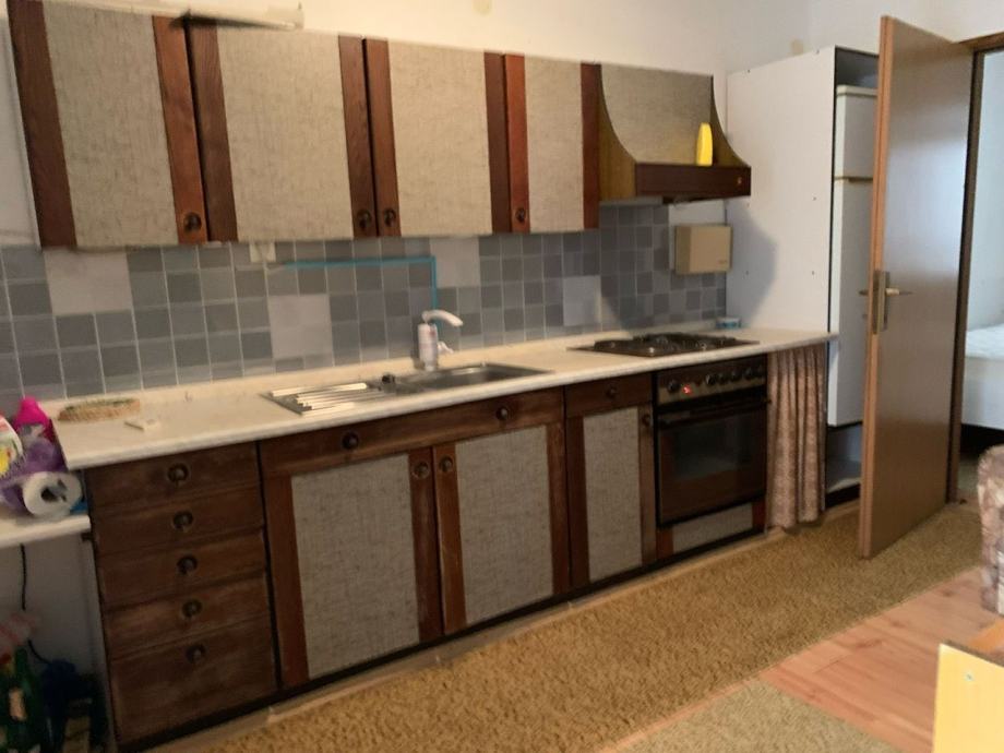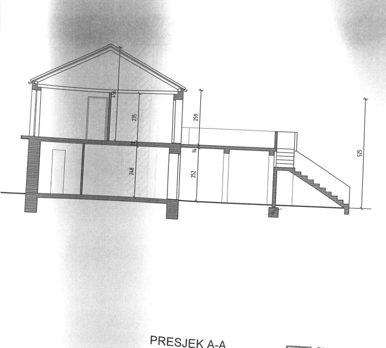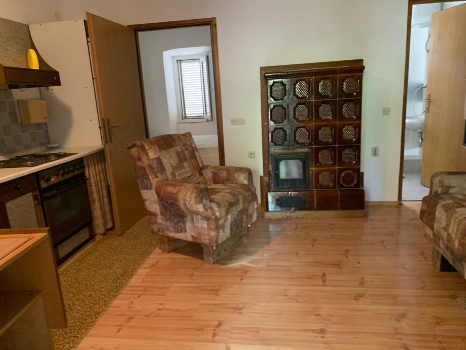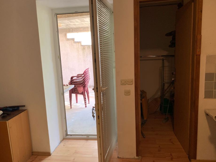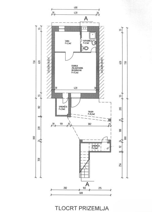 Prizemlje - stan - koji se sastoji od trijema, spremišta, kuhinja s blagovaonom i dnevni boravkom, kupaonice, te spavaće sobe (tlocrt). Ispod stepenica dodatan prostor spremište.