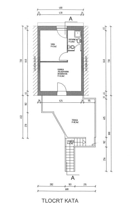 Kat - stepenice, terasa, kuhinja s blagovaonom i dnevni boravkom, kupaonica, te spavaća soba (tlocrt). Nije uređeno!