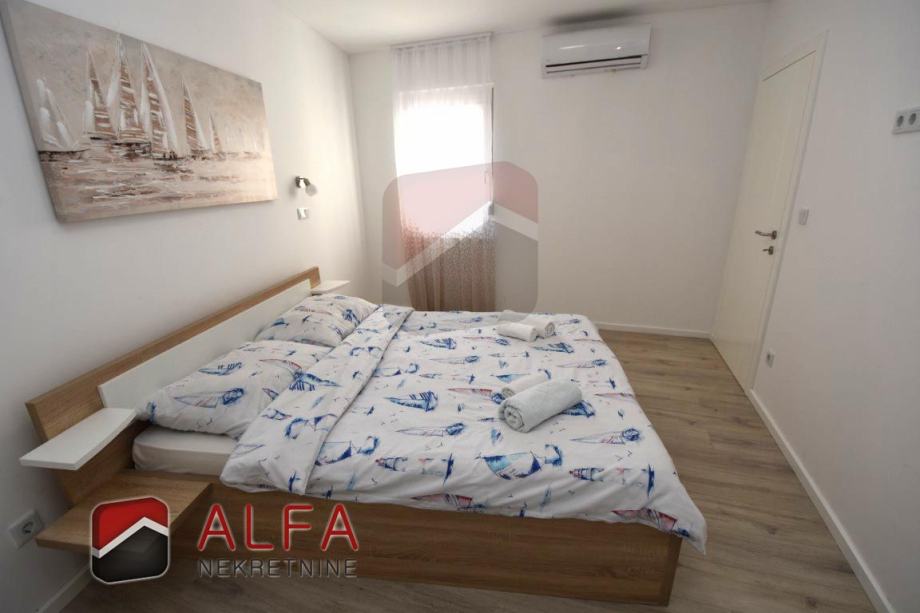 Pirovac, prodaje se nova samostojeća kuća katnica sa dva stana, na mirnoj lokaciji, udaljena 850 m od mora. Sastoji se od prizemlja i kata. Kuća na obje etaže ima sveukupnu površinu 198 m2 i nalazi se na zemljištu od 355 m2.