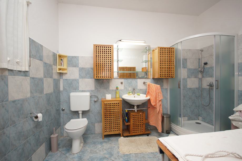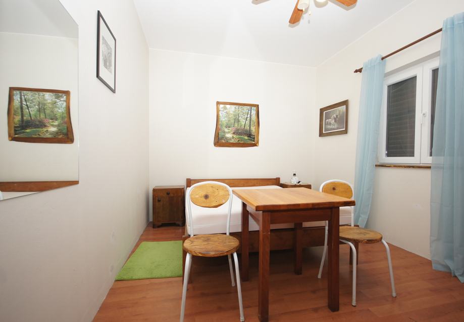 U potkrovlju je dvosoban stan koji se sastoji od spavaće sobe, open space prostora (u kojem se nalazi kuhinja, blagovaona i boravak), ostave, kupaonice i velike natkrivene terase s koje se pruža prekrasan pogled na okolno zelenilo i Vransko jezero u daljini.