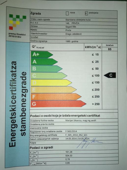 - Vlasnički list 1/1 i svi papiri uredni, građevinska dozvola, uporabna dozvola, energetski certifikat C razred