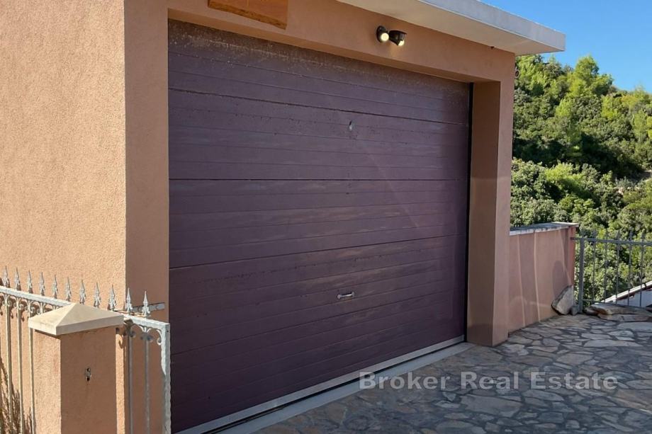 Okućnica je uređena s posebnom pažnjom, cijeli prostor ima sustav automatskog navodnjavanja, a iza kuće nalazi se garaža s rolo vratima i dodatni parking pod nadstrešnicom, dovoljan za šest automobila. Postavljen je i video nadzor koji pokriva kuću i dvorište. Vanjski prostor upotpunjuju kamin, vanjski tuševi te stol uz samo more, idealan za druženja i večere uz more.