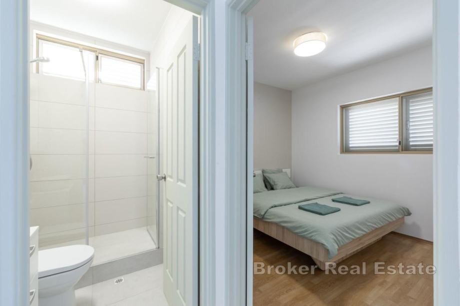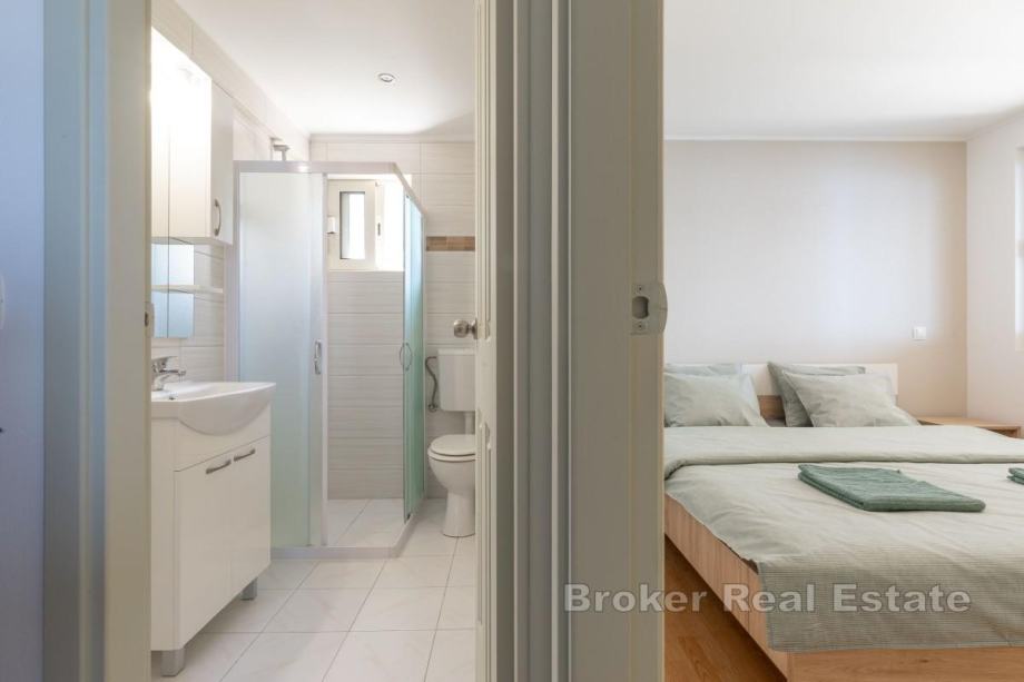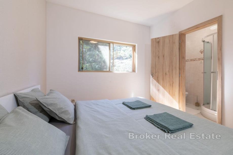 Kuća je koncipirana kao tri zasebne stambene jedinice – trosobna, dvosobna i jednosobna – svaka s vlastitim ulazom i terasom, što omogućava udoban život većoj obitelji ili turistički najam s izvrsnim prihodima. Unutrašnjost je pažljivo uređena, s modernim kupaonicama i walk-in tuševima, a za toplu vodu nalaze se dva bojlera od po sto litara. Krov je termoizoliran s dvadeset centimetara izolacije, što dodatno doprinosi energetskoj učinkovitosti. U potkrovlju se nalazi prazan prostor koji se koristi kao ostava, dok su praonica rublja i pomoćne prostorije smještene u prizemlju. Kuća ima solarni sustav snage 6 kW, koji osigurava energetsku neovisnost tijekom većeg dijela godine, a ugrađen je filter za vodu u jednoj jedinici.