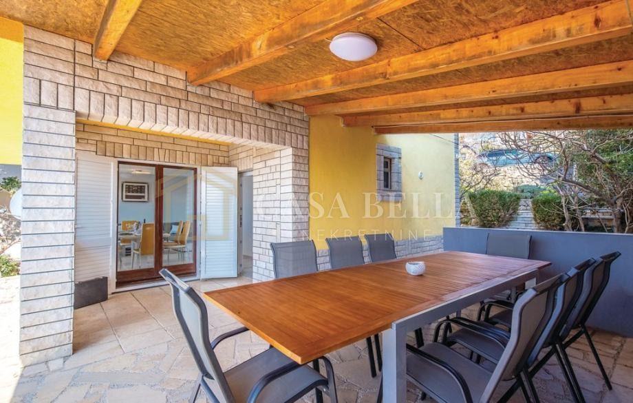 Prednost ove kuće za odmor je velika natkrivena terasa smještena ispred kuće, tik uz bazen. Ovdje možete provoditi veći dio svog vremena, uživajući u osvježavajućim pićima ili pripremajući ukusne delicije na roštilju. Pogled na more s terase dodaje posebnu čar vašem boravku, stvarajući nezaboravne trenutke opuštanja.