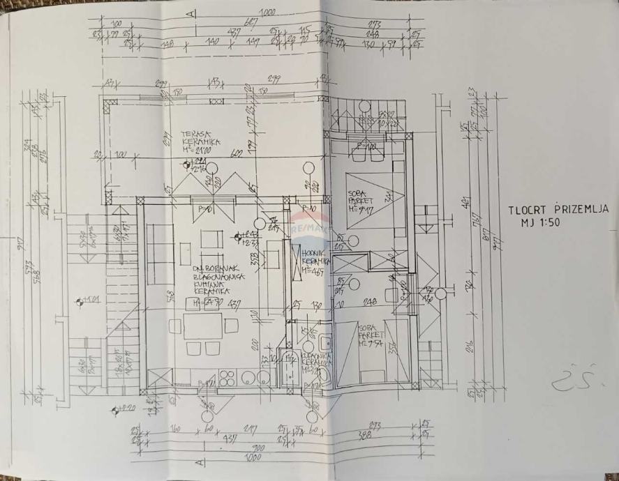 U prizemlju je stan koji se sastoji od natkrivene terase površine 21 m2, ulaznog hodnika, kuhinje i dnevnog boravka s blagavaonicom, kupaonice s wc-om i 2 spavaće sobe.
