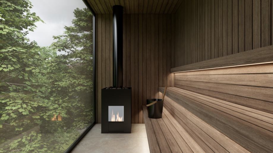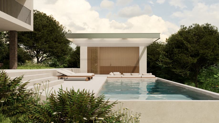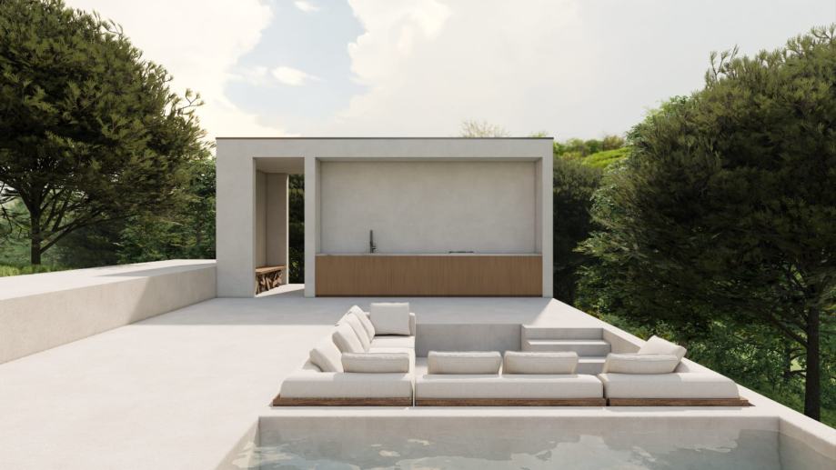 ➡️ velika terasa s bazenom i strojarnicom, fire pit, pomoćni objekt sa šupom, ljetnom kuhinjom i saunom