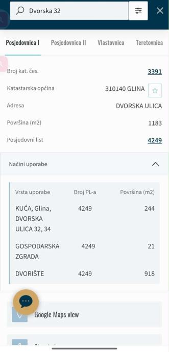 Kuća se nalazi u Glini, Dvorska 32. Papiri uredni, vlasnistvo 1/1.