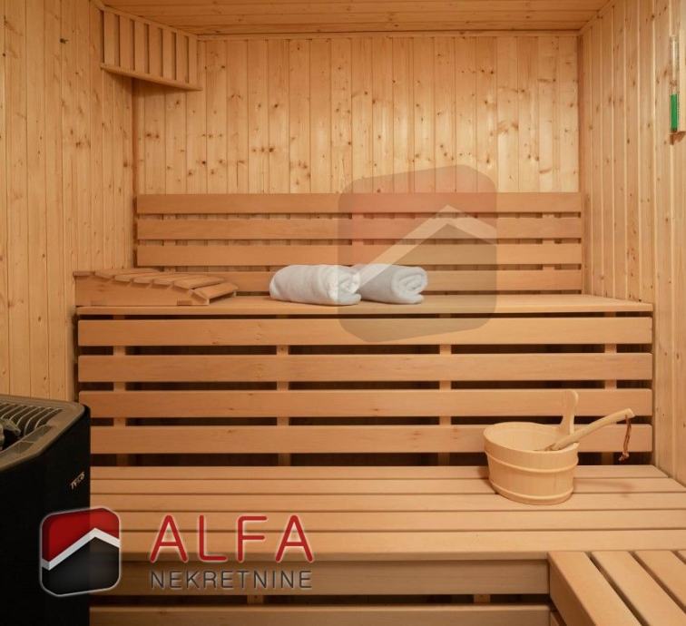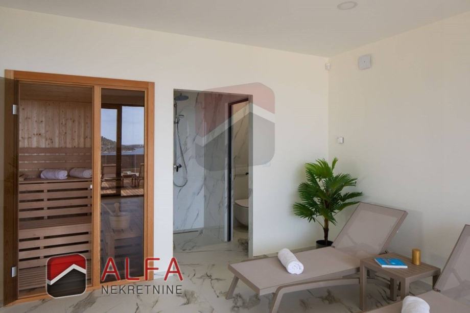 Iz dnevnog boravka i prostorije za wellness se izlazi na prostranu terasu od 140m2 pored koje je grijani preljevni bazen površine 38 m2, koji osim mogućnosti grijanja ima i opciju hlađenja te uključuje i dječji bazen. Prizemlje kuće sa stražnje strane još sadržava i manju prostoriju za tehniku koja ima zaseban ulaz izvana.