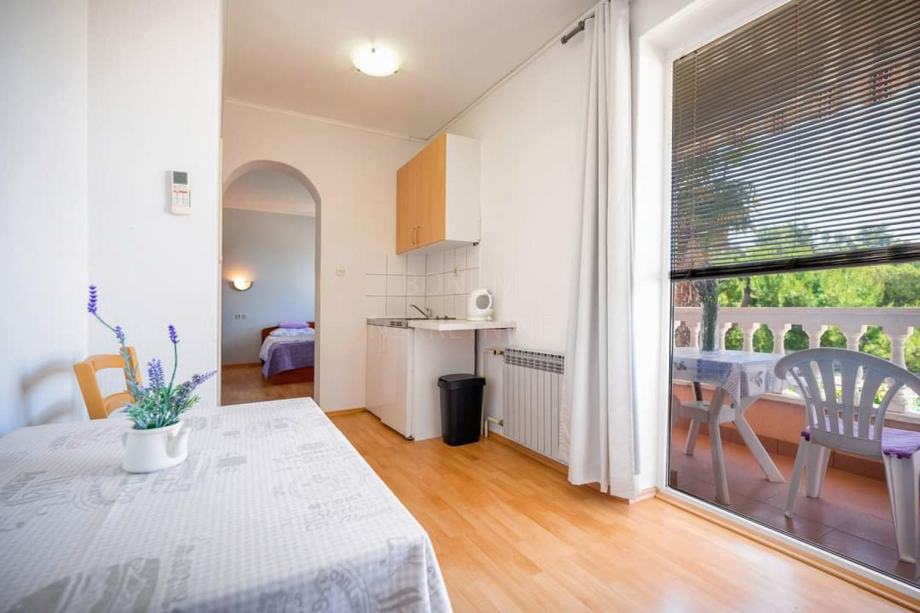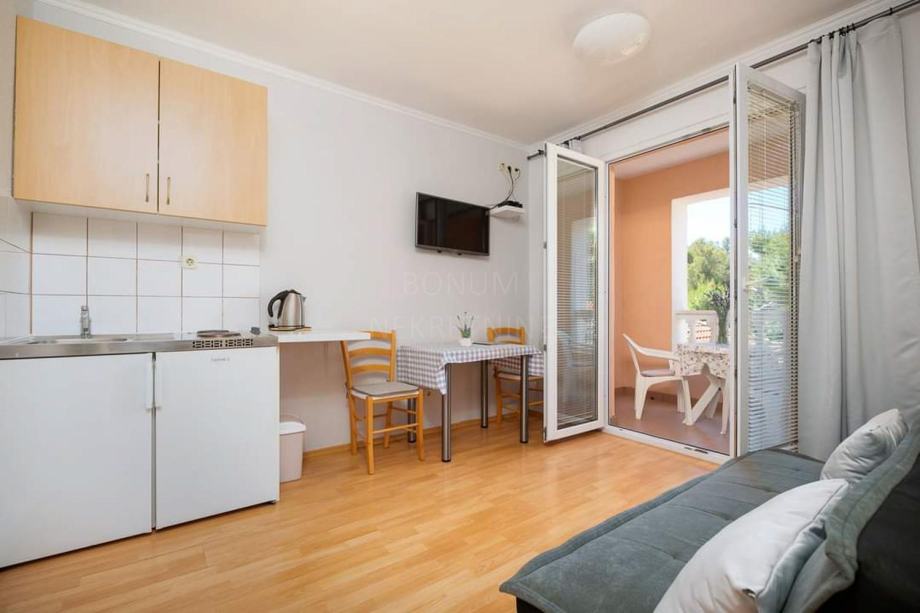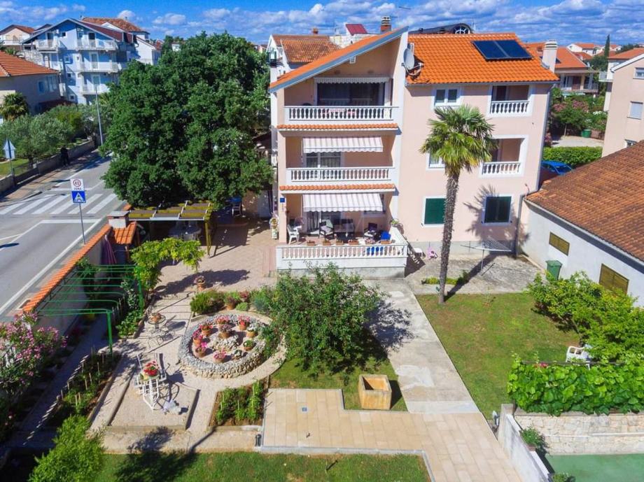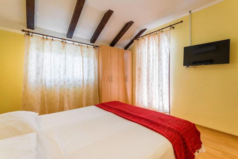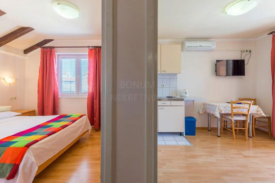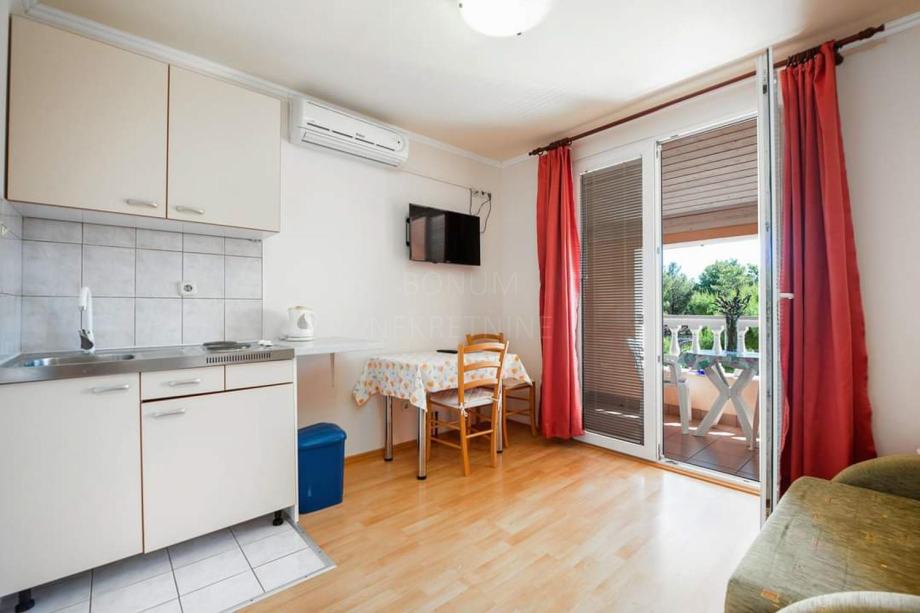Prodaje se kuća sa šest apartmana i uhodanim restoranom na odličnoj lokaciji u Vodicama. U prizemlju se nalazi dvosoban stan povezan s velikom terasom i velikim vrtom. Na prvom katu se nalaze tri jednosobna apartmana od kojih svali ima kuhinju, blagovaonicu, spavaću sobu i terasu. Drugi kat se sastoji od još dva jednosobna apartmana koja se sastoje od jedne spavaće sobe, kupaonice te dnevnog boravka s kuhinjom i blagovaonicom u jednoj cjelini povezani s terasom s koje se pruža lijepi pogled.