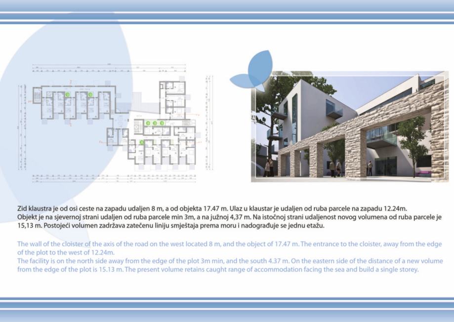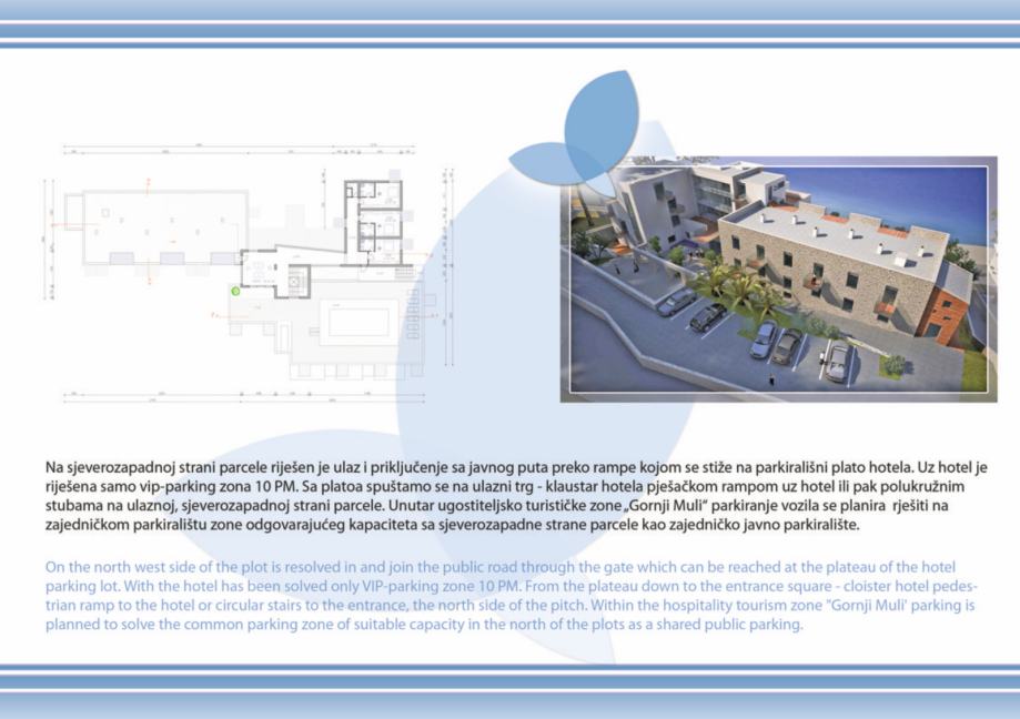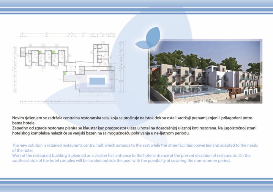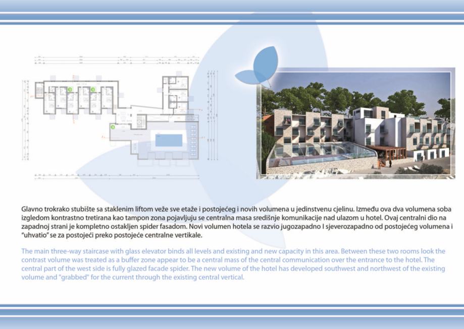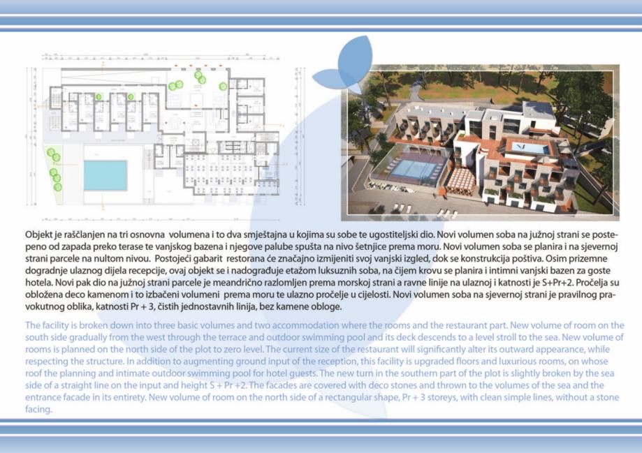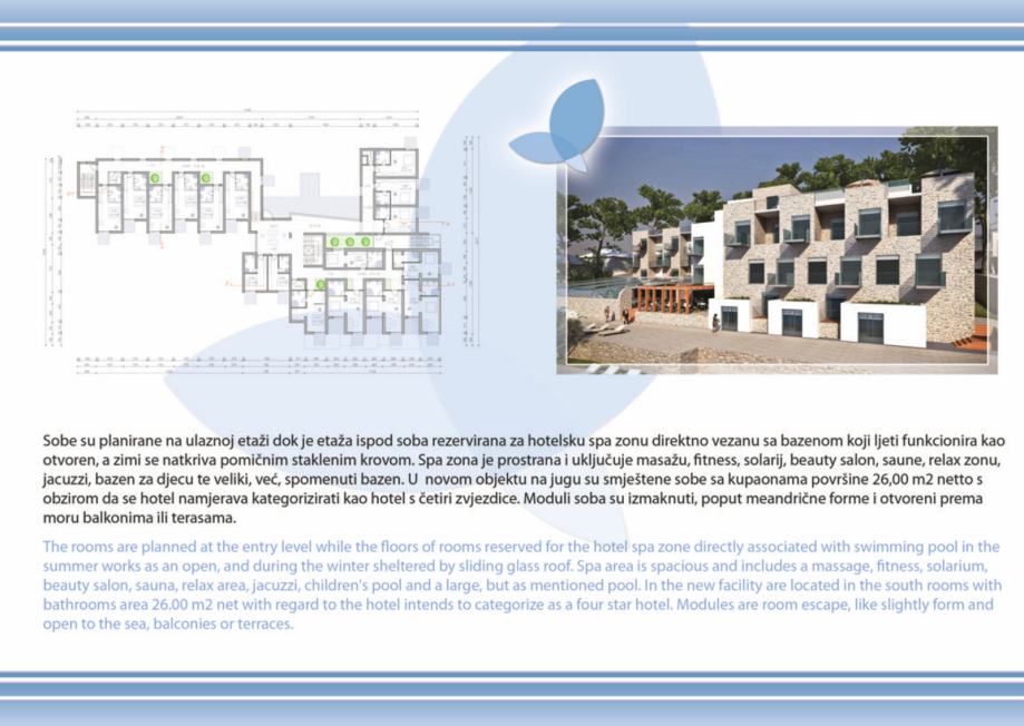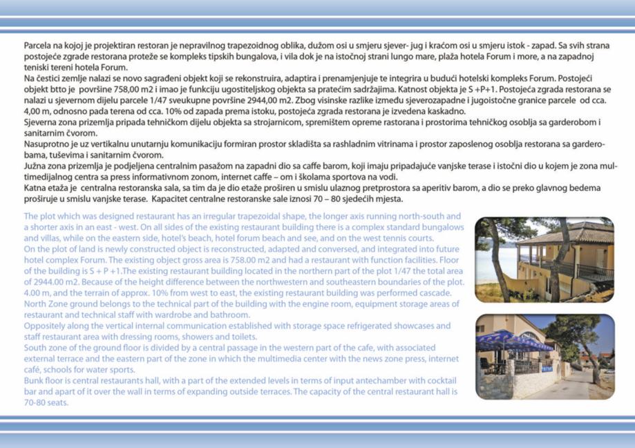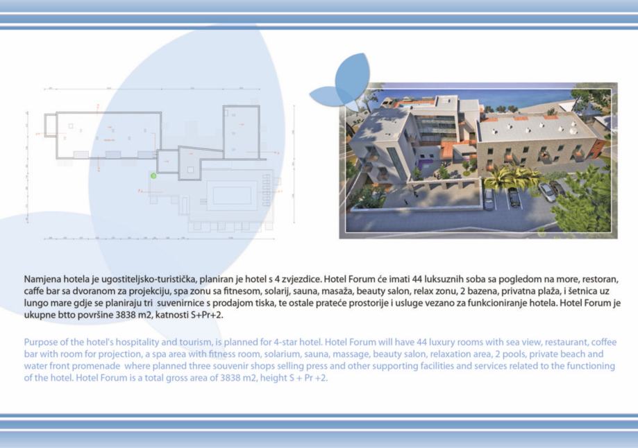- projekt kompleksa se sastoji od novosagrađenog objekta od btto 758 m2 koji je potrebno rekonstruirati i dograditi u budući hotelski kompleks "Forum", koji se sastoji od Hotela "Forum" 4* sa 44 luksuzne sobe, tipskih bungalova i villa btto povrsine 3.838 m2, katnost S+Pr+2, sa svim pratećim hotelskim sadržajima, welness, fitness, masaža, caffe barovi, kongresni centar, dva bazena, restoranom, teniskim terenom, privatnom plazom i šetnicom, za koje je sve izdana važeća građevinska dozvola.