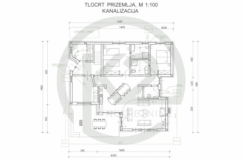 U prizemlju je predviđen veliki dnevni prostor koji objedinjuje dnevni boravak, kuhinju i blagovaonicu u otvorenu i svijetlu cjelinu. Prema projektu moguće je organizirati 5 do 6 spavaćih soba, pri čemu svaka može imati vlastitu kupaonicu, što osigurava visok stupanj komfora i privatnosti. U prizemlju su također planirani gostinjski WC, tehnička prostorija te dodatni prostor koji se može koristiti kao ured, fitness ili druga pomoćna prostorija.