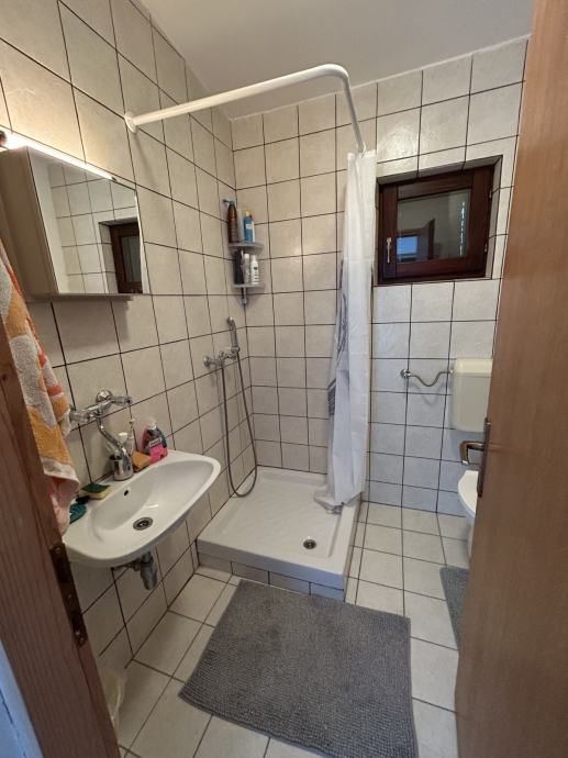 Prizemlje 37,5 m2 (dvije spavaće sobe, kupaonica, dnevna i kuhinja) i 15 m2 natkrivene terase, peć na drva.