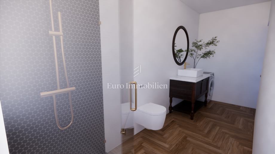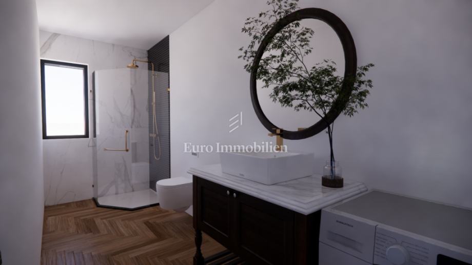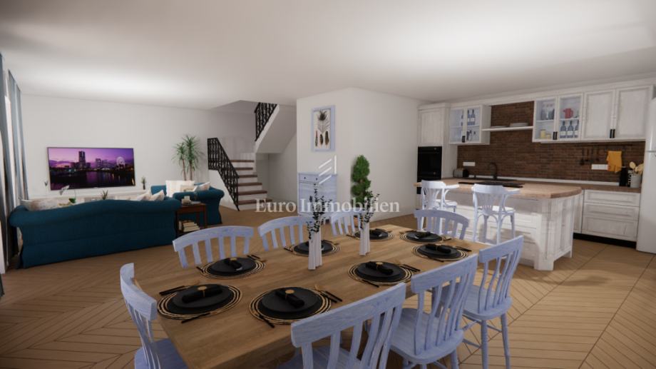 Nova dvojna kuća netto površine 172,17 m2 (brutto 209,15 m2) na lijepoj lokaciji, okružena obiteljskim villama. Kuća se sastoji od podruma, prizemlja i kata. Podrum se može urediti u prostore za druženje, igraonicu za djecu, prostor na vježbanje ili po želji. Prizemlje je open space koji objedinjuje dnevni boravak, kuhinju i blagovaonu s izlazima na okućnicu i terase. U prizemlju je i jedna kupaonica. Na katu su tri komforne spavaće sobe te jedna kupaonica. Kuća ima podno grijanje.