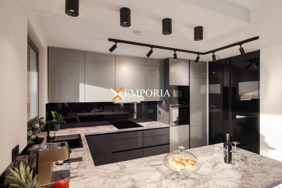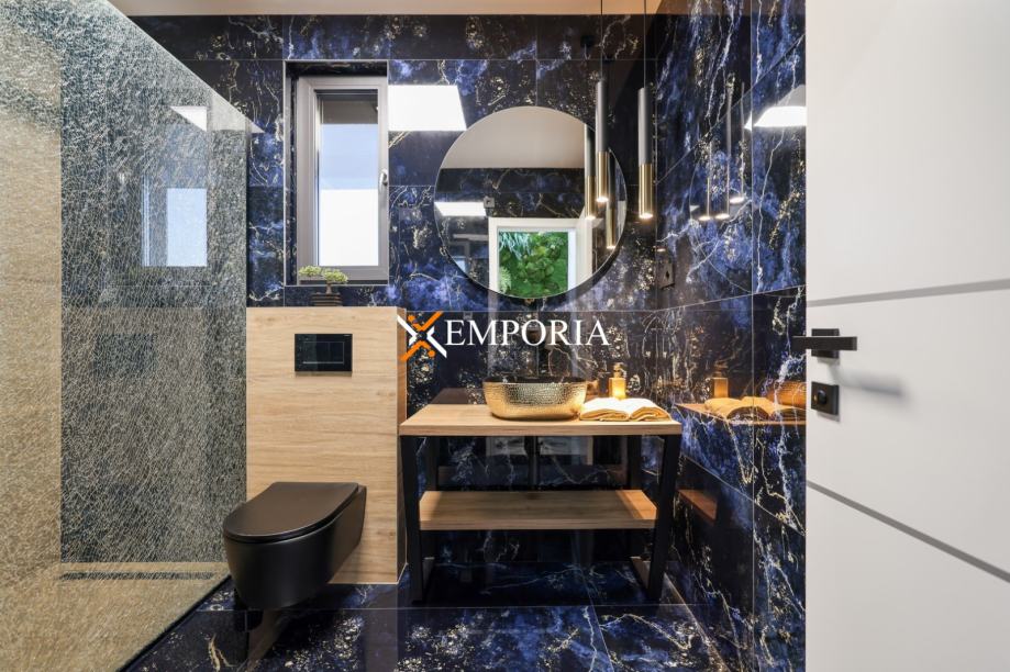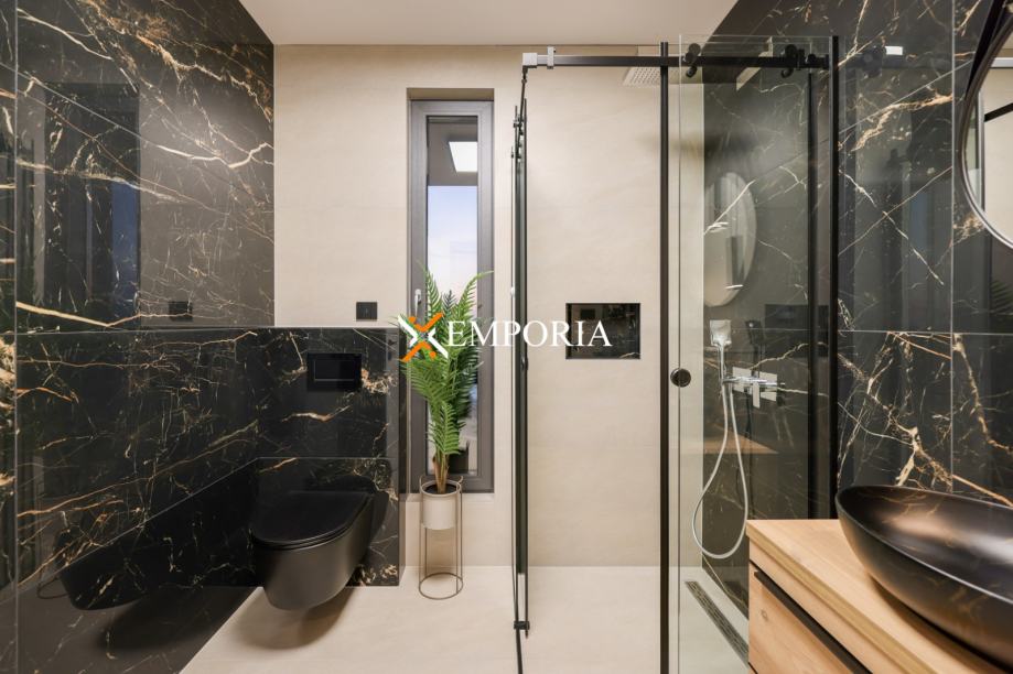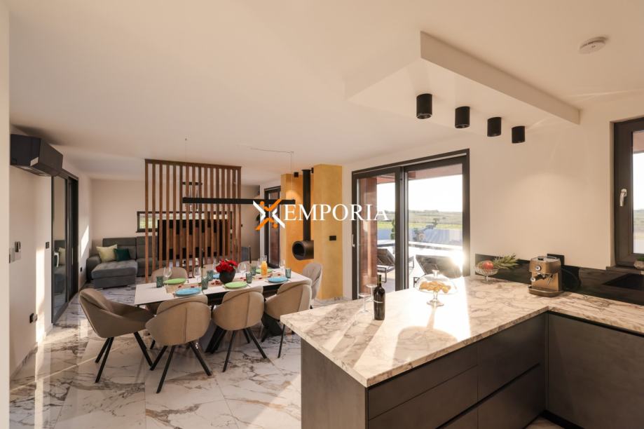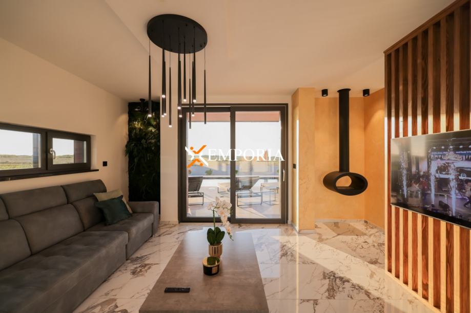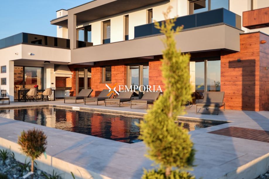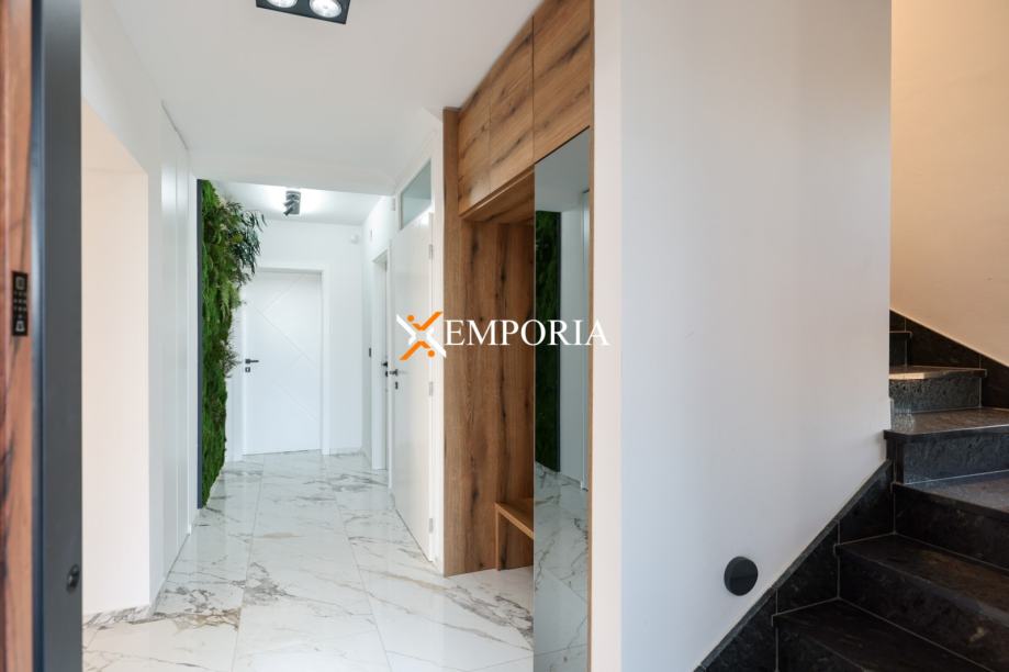 Podno grijanje preko dizalica topline kroz cijelu kuću. Klima uređaj u svakoj prostoriji, također putem dizalica topline. Na krovu su solarni paneli koji služe za proizvodnju tople vode te grijanje kuće. Krov kuće je izveden ravno s tpo folijom od 2 mm na koju se daje garancija od 10 godina. Prizemno dio fasade ventilirana fasada s aluminijskim panelima u boji drva. Pokraj bazena je vanjski tuš. Bazen s grijanjem. Na parkiralištu se nalazi punionica za električni automobil. Ulazna vrata su Schuco, osim što su protuprovalna i protupožarna, ona su i sigurnosna, otvraju se na otisak prsta i na tipkuvnicu. Sobna vrata od punog drva.