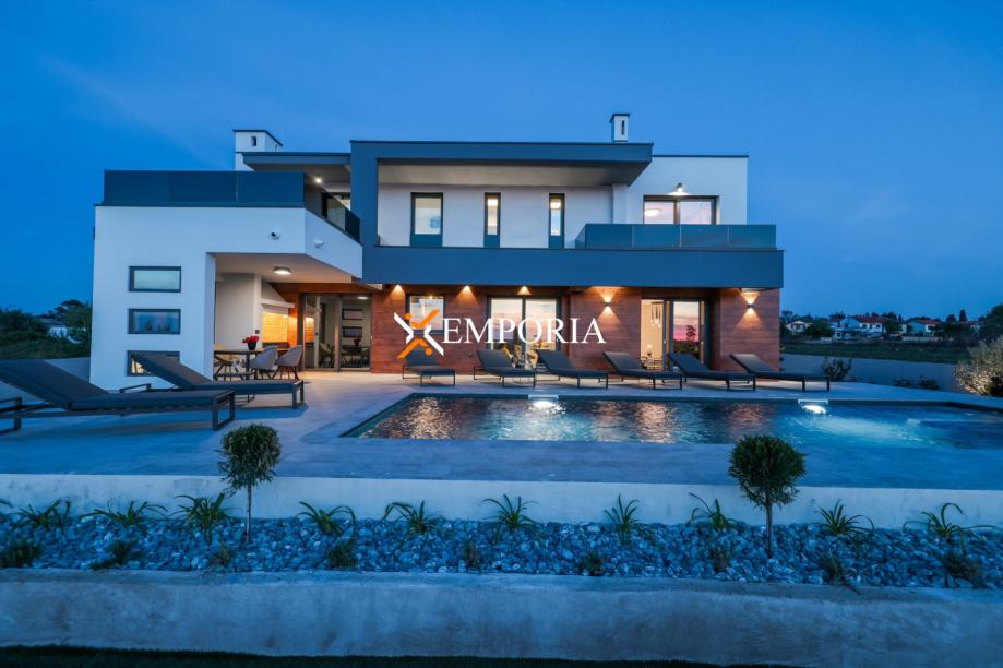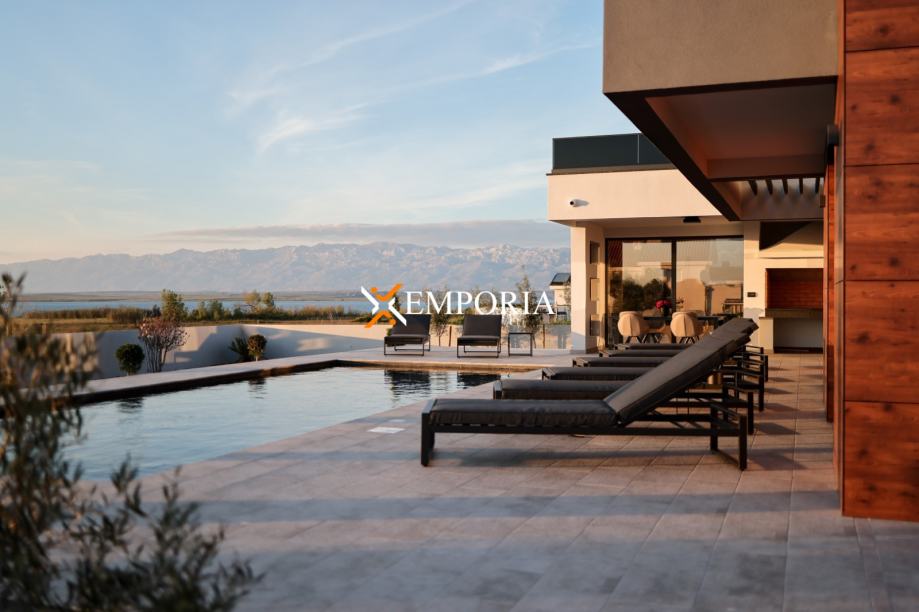 In Privlaka, in the Sabunike part, a luxury villa with a swimming pool is for sale. It is only 290 m to the sea. The house has one living unit and the complete equipment and furniture are included in the price. There is a beautiful sea view.