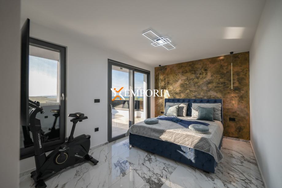 Kuću čine prizemlje i prvi kat. Prizemlje čine predsoblje, dnevni boravak, kuhinja s blagovaonicom, spavaća soba, kupaonica, gospodarska soba i ostava. Iz dnevnog boravka se izlazi na veliku terasu gdje se nalazi bazen. Na prvom katu se nalaze tri spavaće sobe, svaka s vlastitom kupaonicom i terasom.