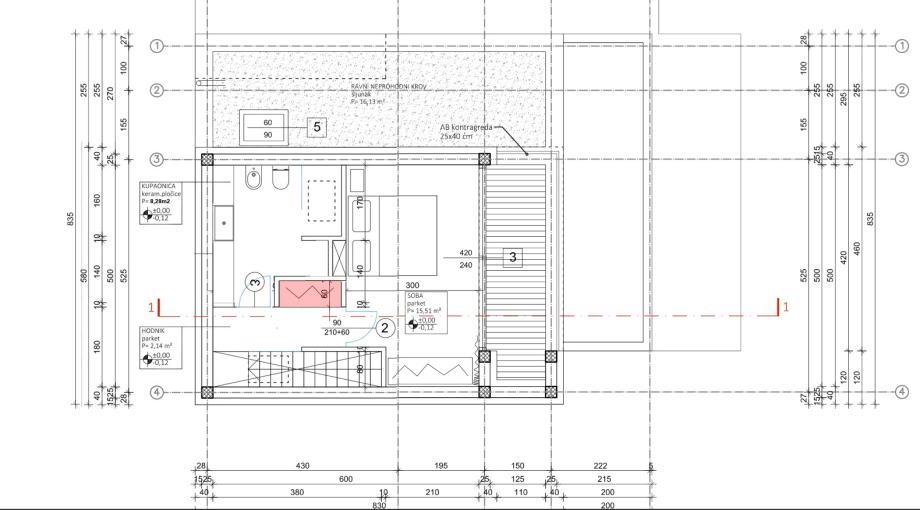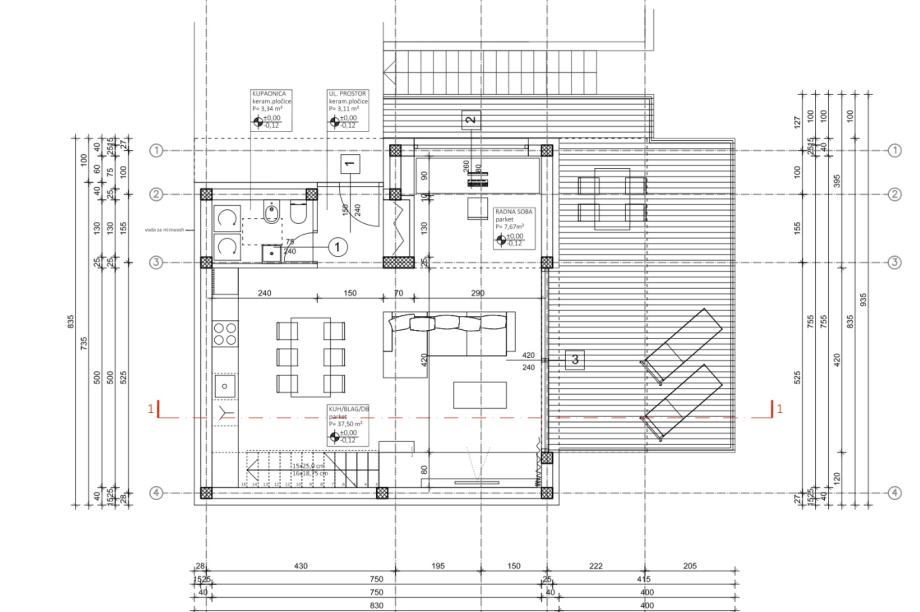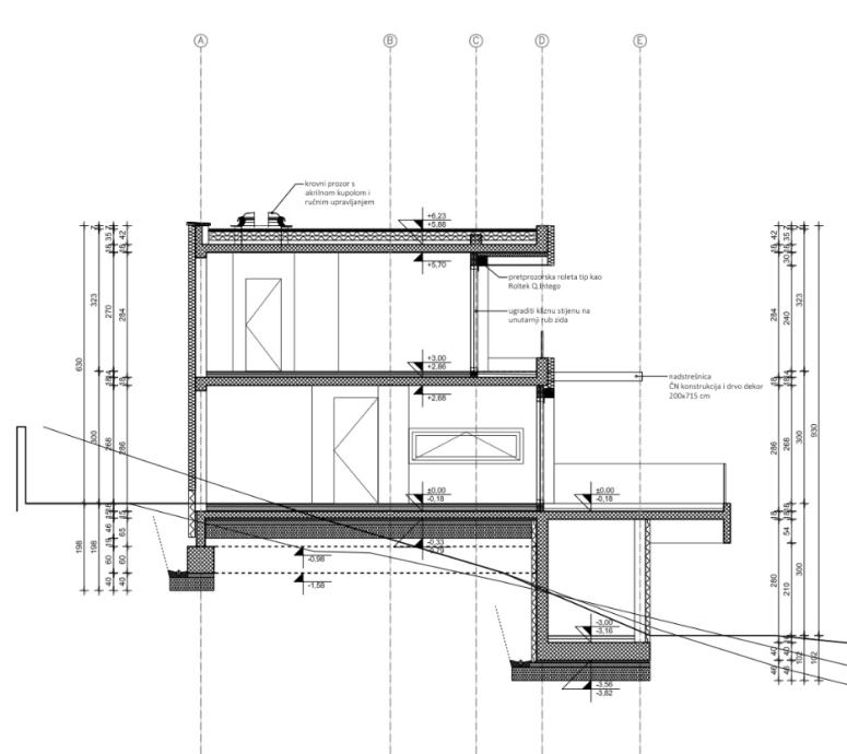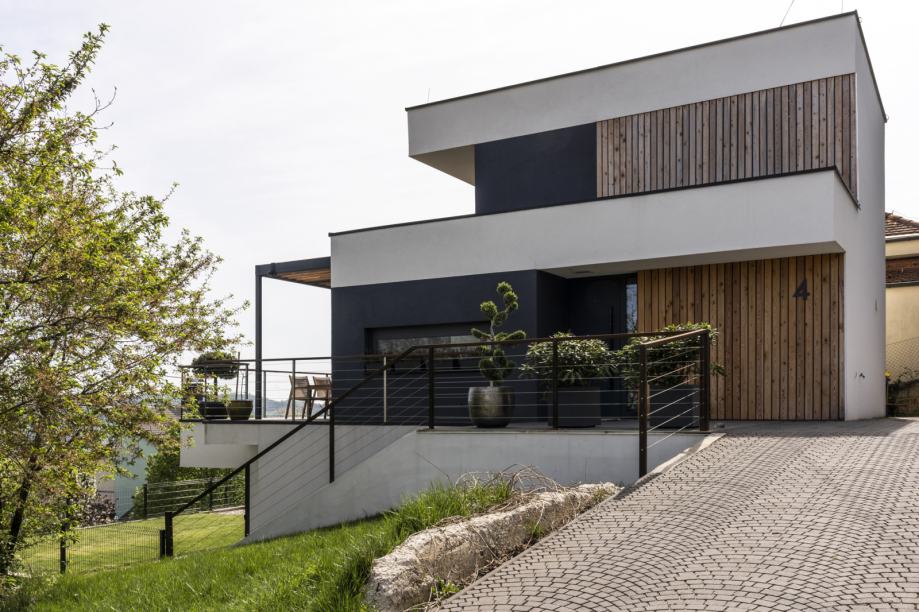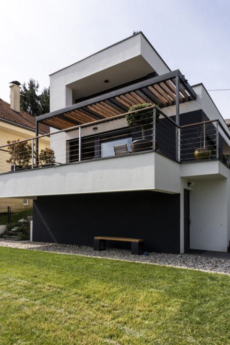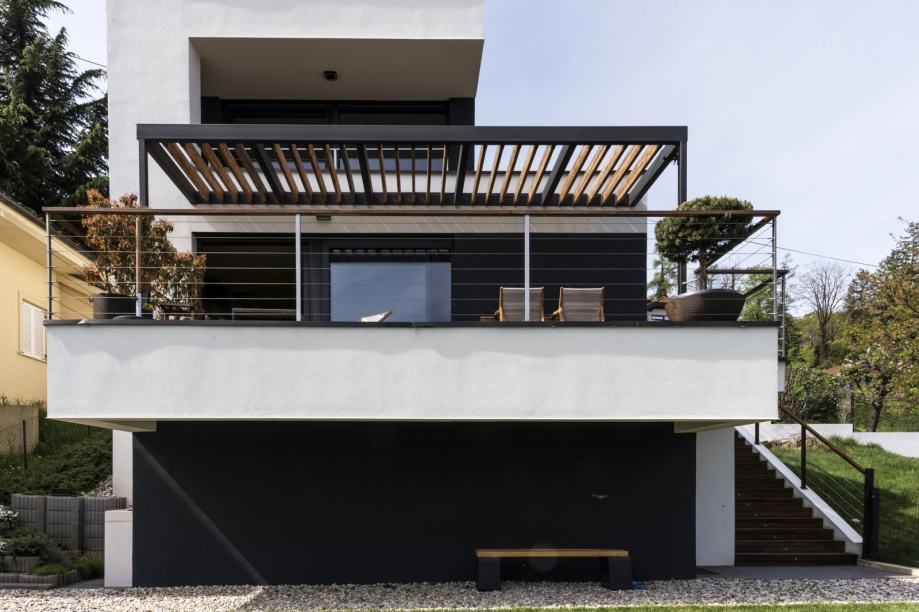 Kuća je građena betonom i porotherm ciglom od 25 cm debljine a izolirana kamenom vunom debljine 15 cm. Dijelovi fasade izvedeni su kao ventilirajuća fasada i obloženi sibirskim arišem. Krovovi i terase obučeni su Sika folijom za zaštitu od proboja vode a svi odvodi su sakriveni u fasadu. Kompletne terase i stepenice prema vrtu izvedeni su u decking varijanti obloženi egzotičnim drvetom (Cumaru) koje ima vijek trajanja preko 50 godina.