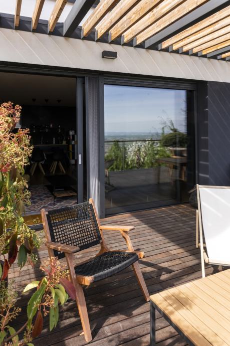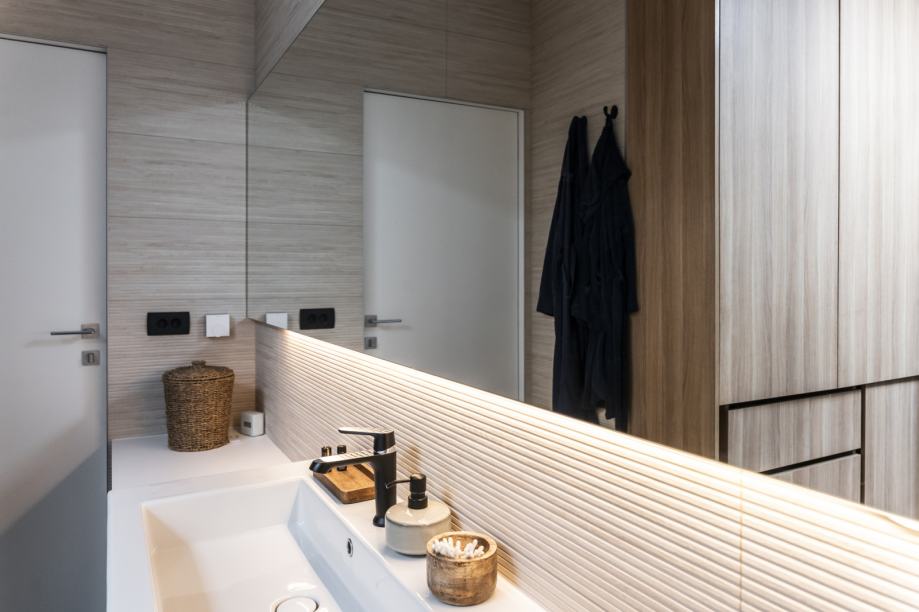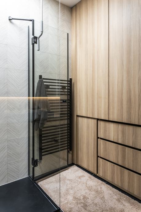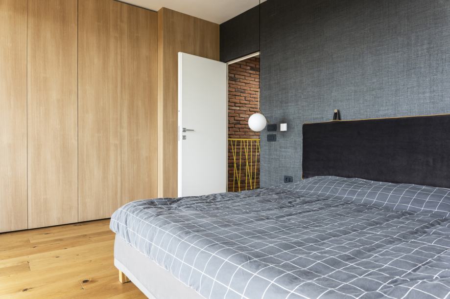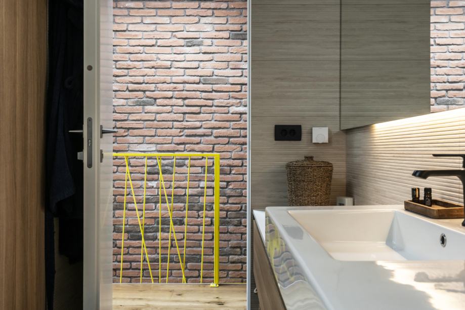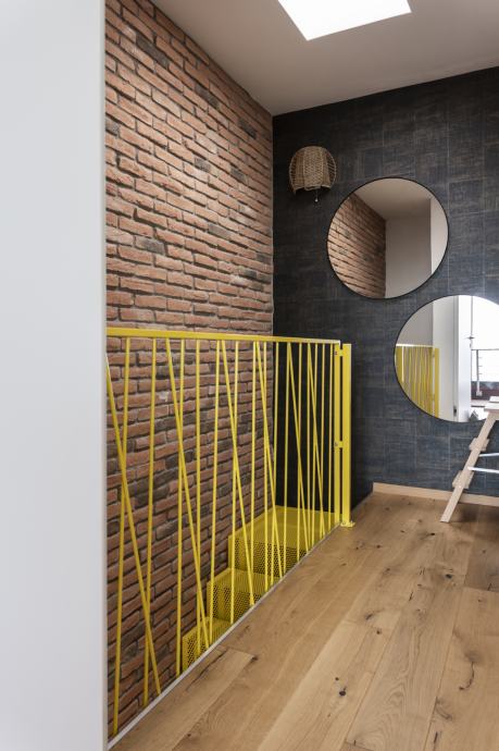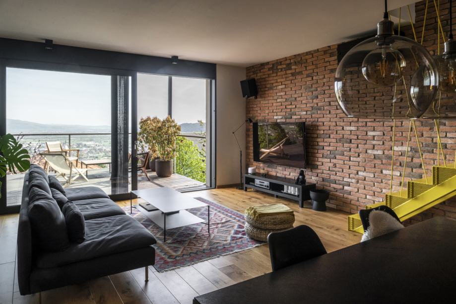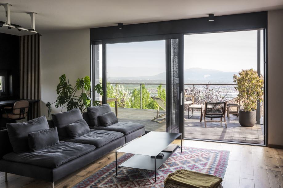 Ulazna vrata su aluminijska (150x240cm) Inotherm sa otvaranjem preko koda ili otiska prsta. Dvije velike podizno klizne stijene (420x240cm) su također aluminijske kao i veliki duguljasti prozor u radnoj sobi. 3 krovna prozora su Velux. U kući su ugrađena troja sobna vrata sa skrivenim štokom, tako da izgledaju kao da su dio zida. Veliki zid u dnevnom boravku koji se stepenicama prostire i na kat obložen je dekorativnom ciglom. Podna obloga u cijeloj kući osim u kupaonici i wc-u je prvoklasni hrastov parket. U kuću su ugrađena 4 ormara po mjeri (na ulazu u kuću, u hodniku kata, u kupaonici i spavaćoj sobi) plus podni ormar ispod radnog stola u radnoj sobi.