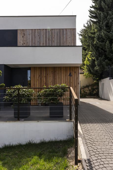 Prilazni put od 30m koji se proteže kroz cijelu parcelu širine 3,30-4m obložen je Semmelrock kockom. Ograde na terasi su od inoxa s drvenim rukohvatom. Ograda na pročelju, stepenicama i dvorišna vrata su izvedeni u Corten čeliku.