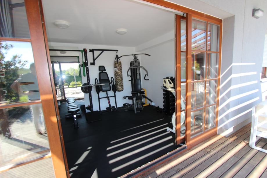 Sporedne prostorije prizemlja kao što su teretana i sauna, imaju izlaz na natkrivenu teresu od 25 m2 te im se može pristupiti i iz stambenog predprostora. Garaža s dva parkirna mjesta je također spojena sa stambenim predprostorom, a iz nje omogućen pristup kotlovnici, koja ima ulaz i s vanjske strane.