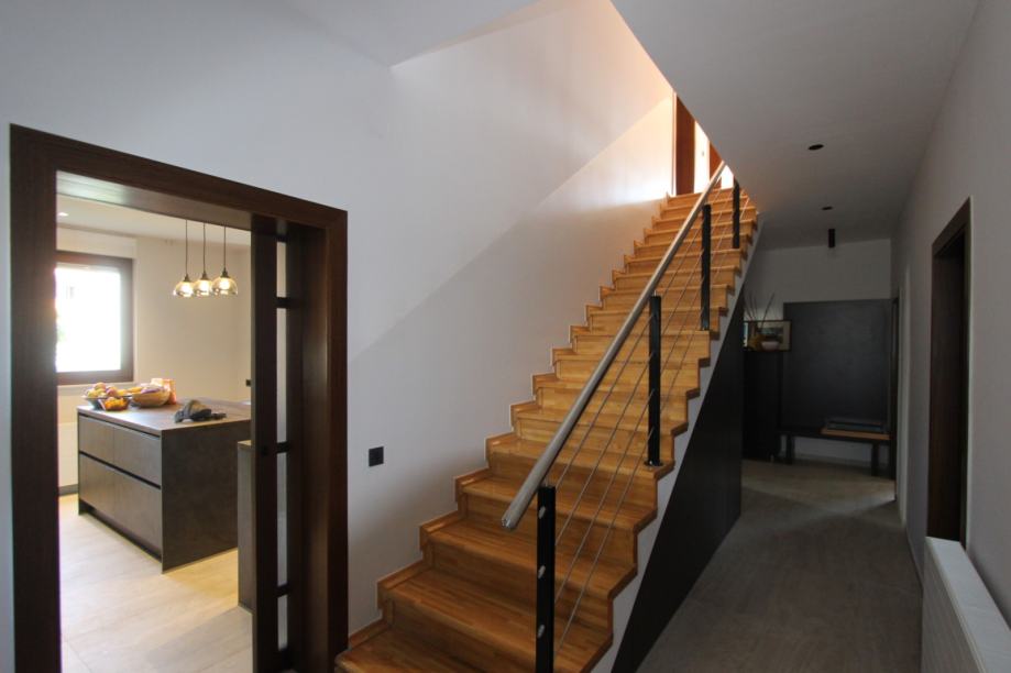 Prizemlje se sastoji od ulaznog hola koji vodi do stepeništa na prvi kat, moderno uređene i kompletno opremljene kuhinje, blagavonice, prostranog boravka, zasebnog toaleta.