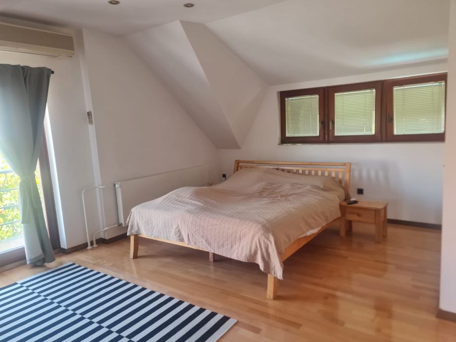 The staircase further leads to a high attic where there is a large bathroom with a bathtub and a shower cabin, a bedroom with a wardrobe and a balcony. In the part of the upper space there is also an attic and additional storage.