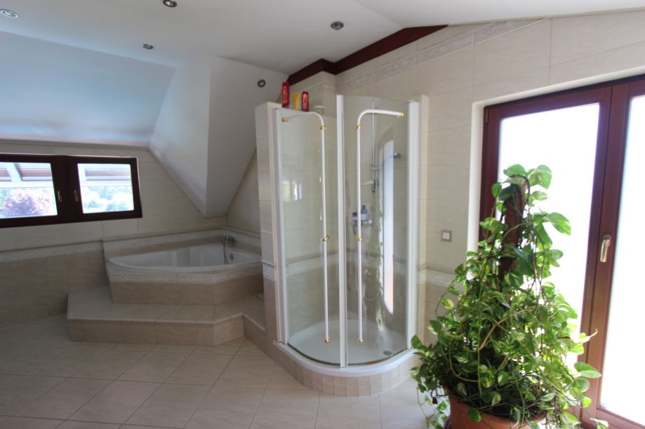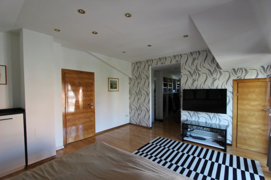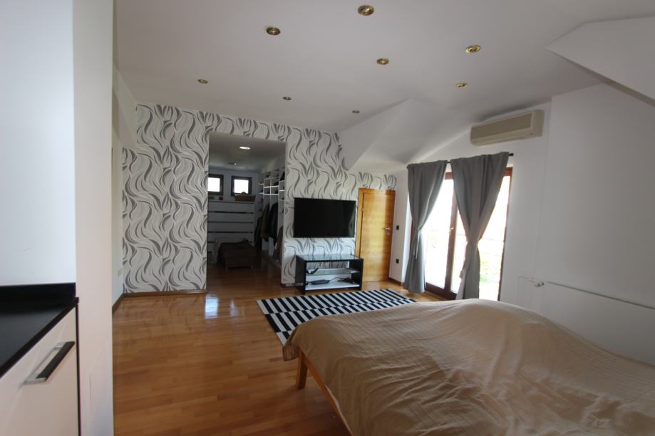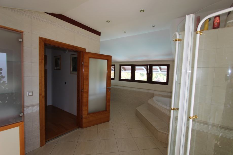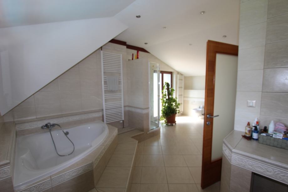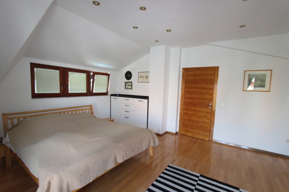 Stubište dalje vodi do visokog potkrovlja u kojem se nalazi velika kupaona s kadom i tuš kabinom, spavaćamo sobom s garderobom i balkonom. U dijelu gornjeg prostora nalazi se još i tavan te dodatno spremište.