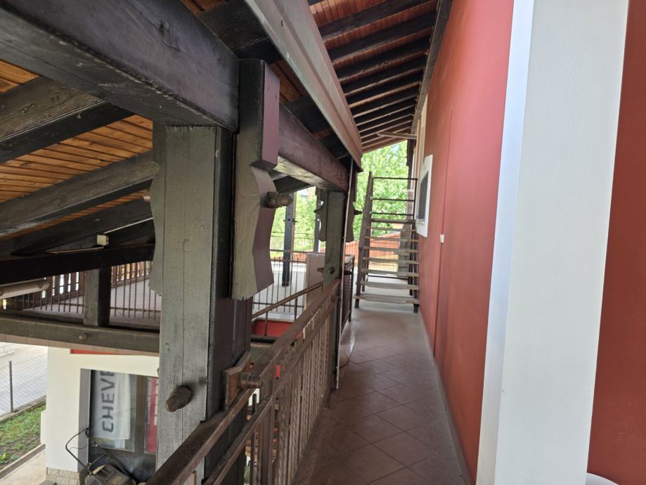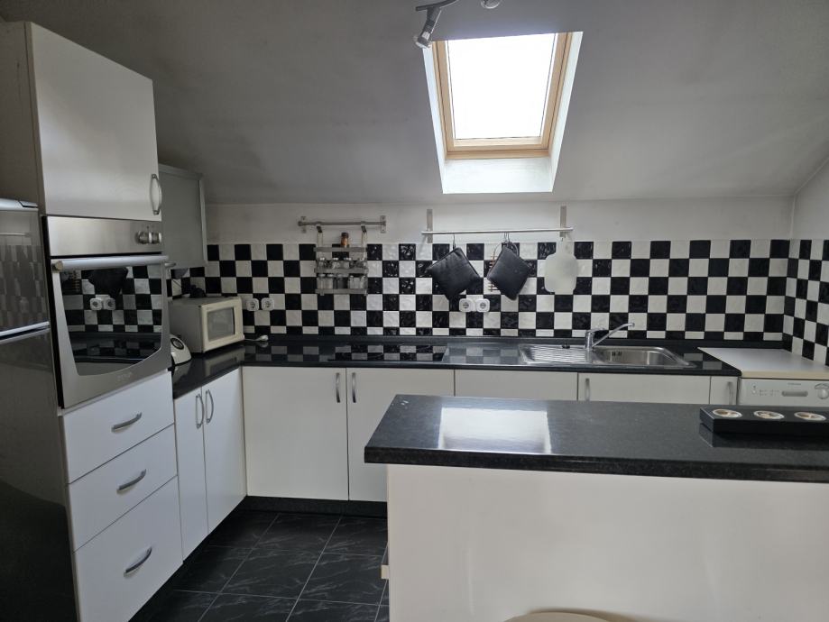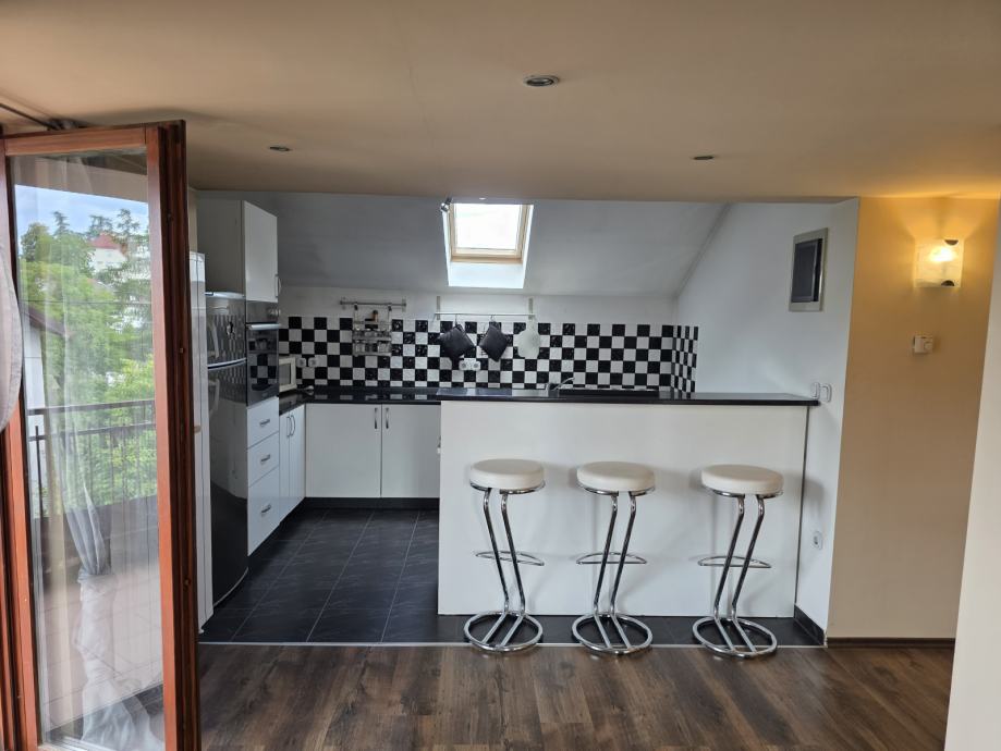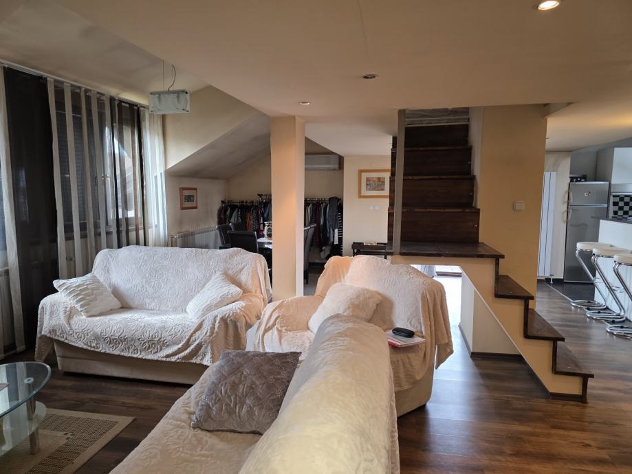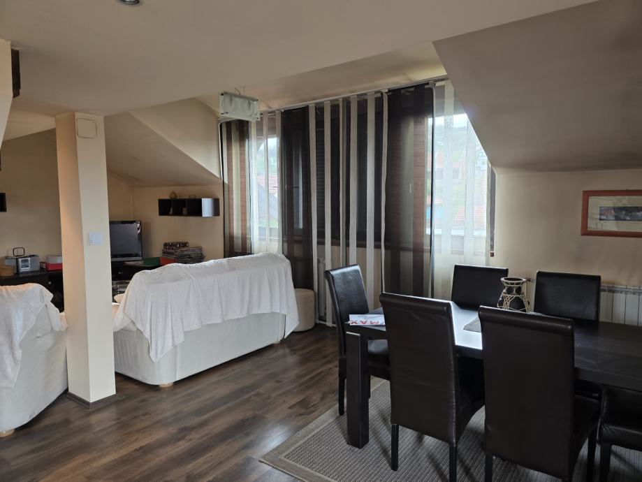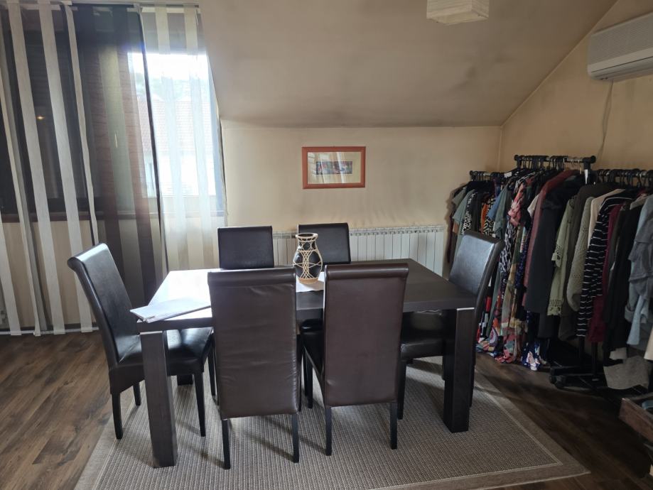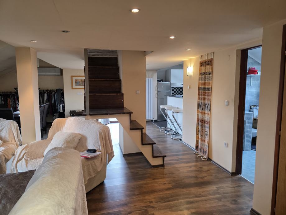 U prizemlju je kuhinja , veliki dnevni boravak i kupaonica s Wc-om.