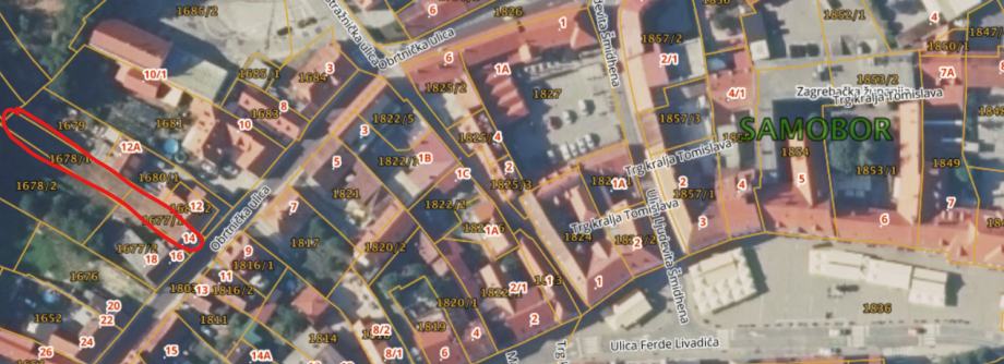 Prodaju se dvije katastarske čestice 1677/1 - kuća i dvorište i 1678/1 -oranica (oznaka 14 na fotografiji iz katastra) Lokacija objekta je u uskom centru Samobora, na minutu hoda od glavnog trga.