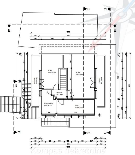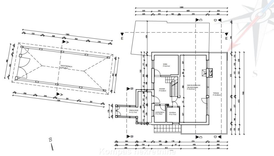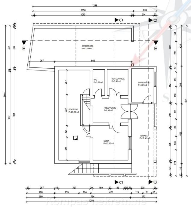 SUTEREN ( 112 m2 ): poseban vanjski ulaz, kupaonica, kotlovnica, tri prostorije koje služe kao spremište, izlaz na terasu ( 17 m2 ) s pripremom za bazen (4x2x1,6m).