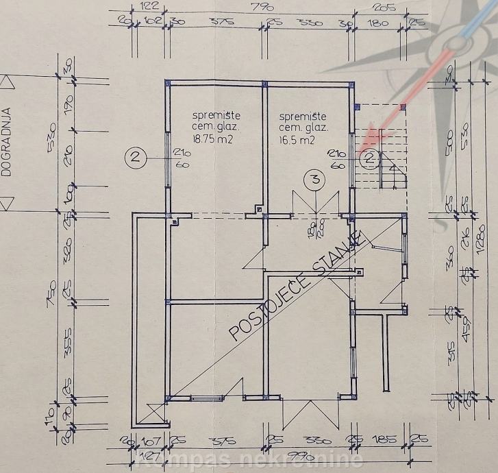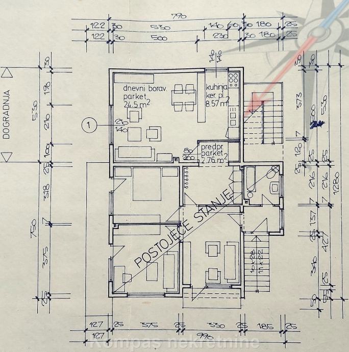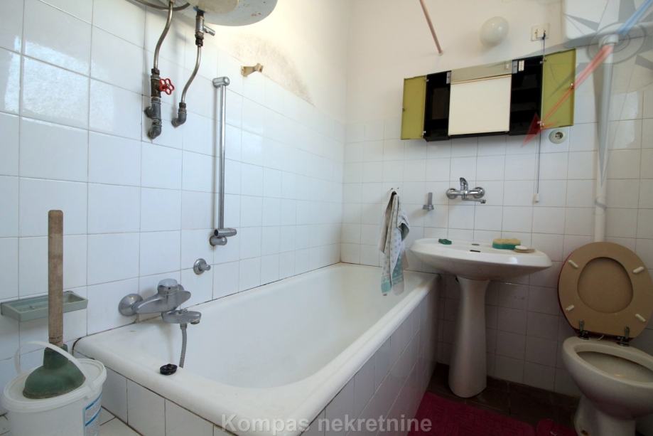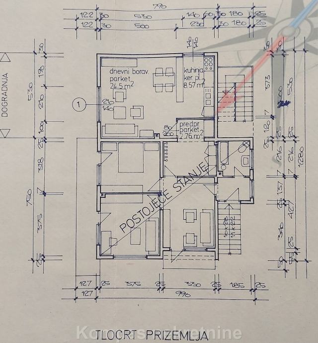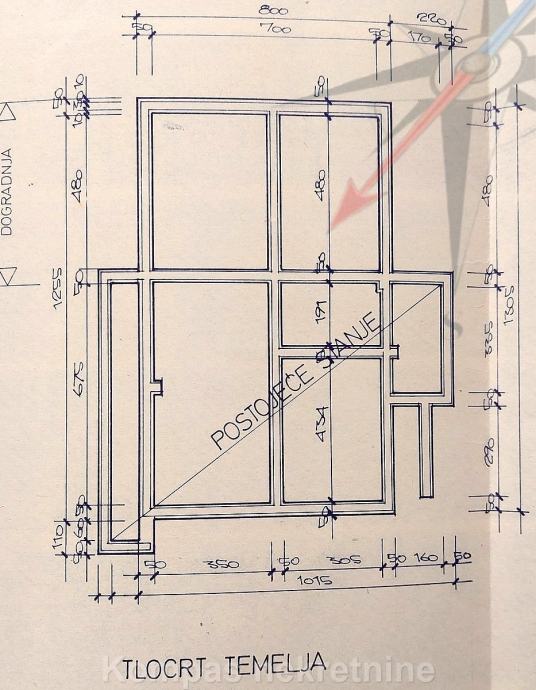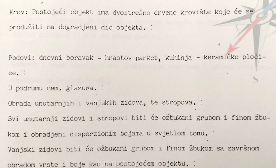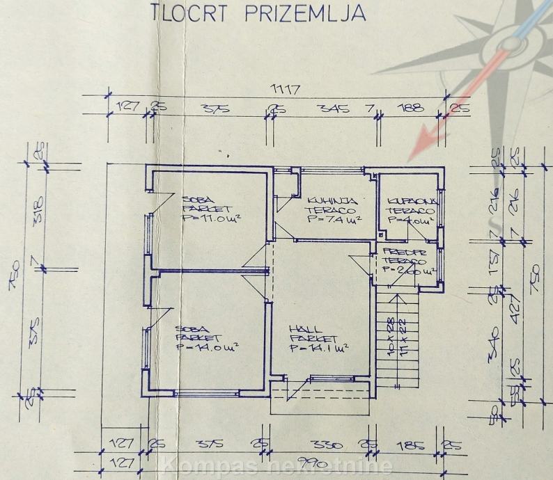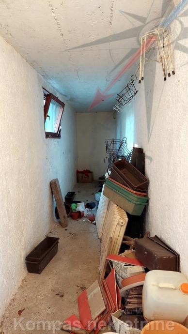 PRIZEMLJE: glavni ulaz u kuću, kupaonica, prostor za dvije kuhinje, predsoblje, tri sobe, balkon, terasa .