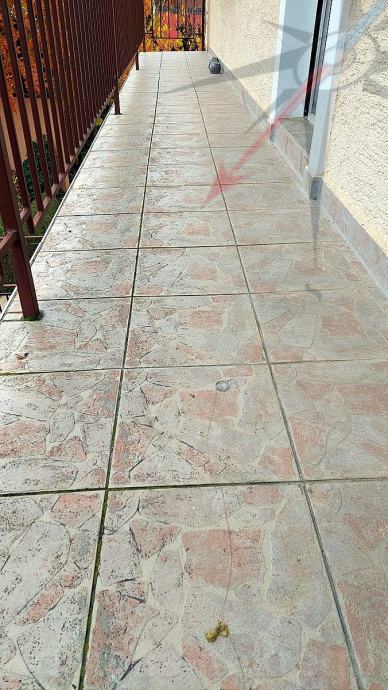 1. KAT: ulaz u kuću, dnevni boravak, kuhinja s balkonom, kupaonica, ostava ispod stepenica, terasa i stepenice do prizemlja.