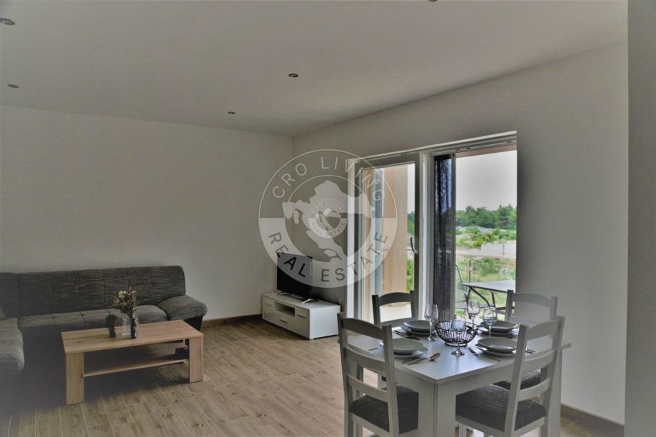 Prizemlje: Stan s dnevnim boravkom, kuhinjom i blagovaonom u otvorenom prostoru te dodatna spavaća soba s kupaonom.