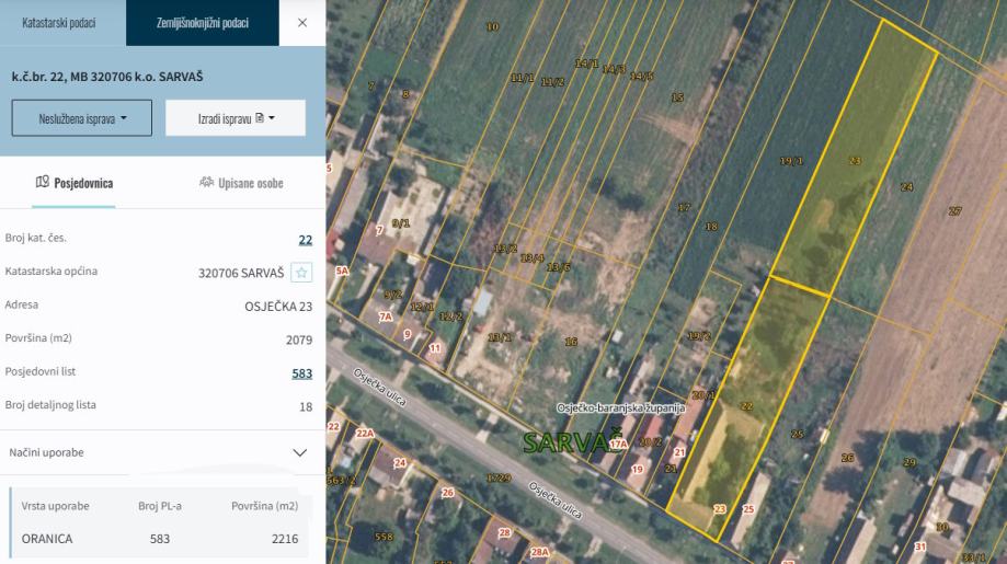 Prodaje se kuća u Sarvašu, Osječka 23 sa velikom okućnicom kčbr 22 i oranicom kčbr 23 ukupne površine cca 4600m2. Mogućnost gradnje na drugoj parceli. Cijena po dogovoru. (Š)