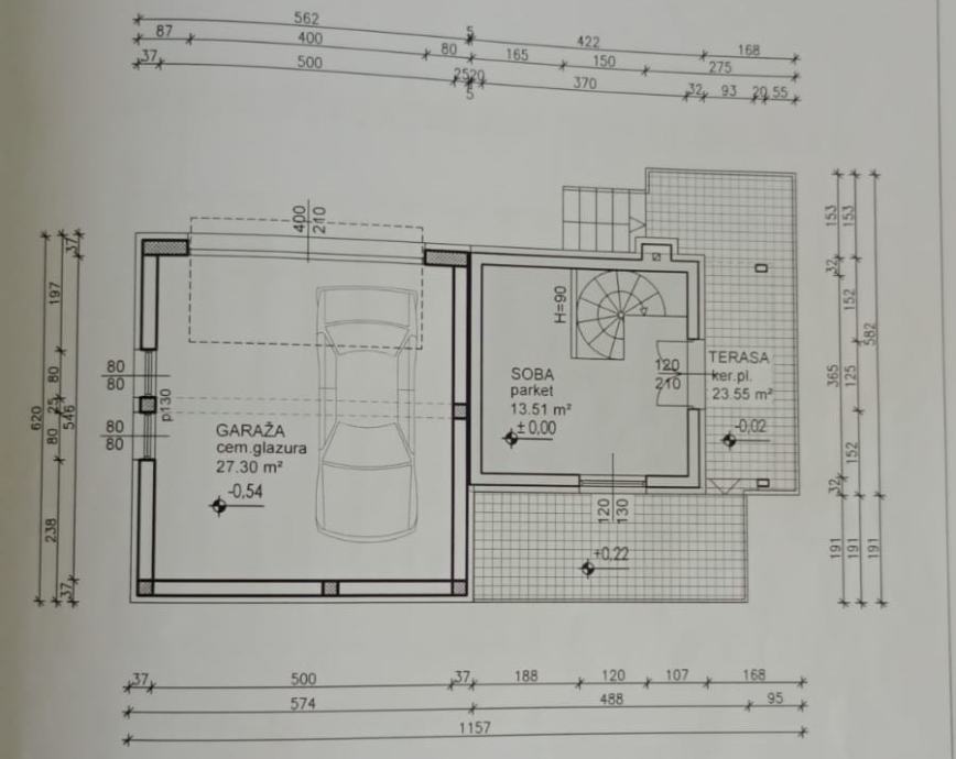 Kuća se sastoji od dnevnog boravka sa kuhinjom, spavaće sobe sa garderobom, jedne manje sobe, prostrane kupaone sa WCom, sve ukupne površine 67m2. U sklopu kuće je garaža od 27m2.