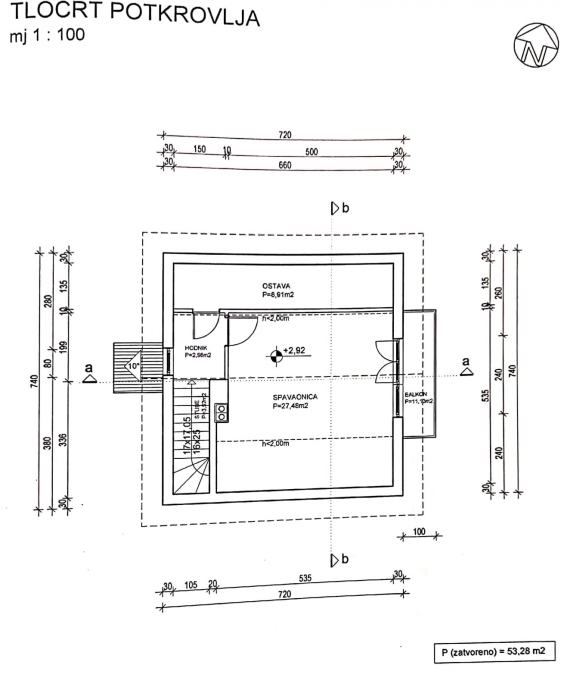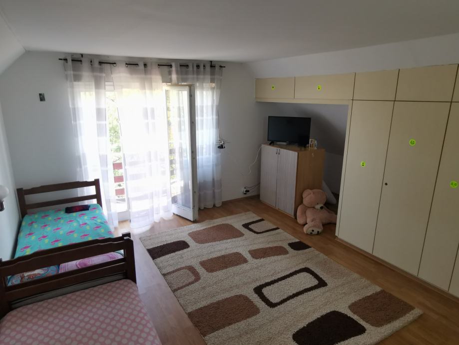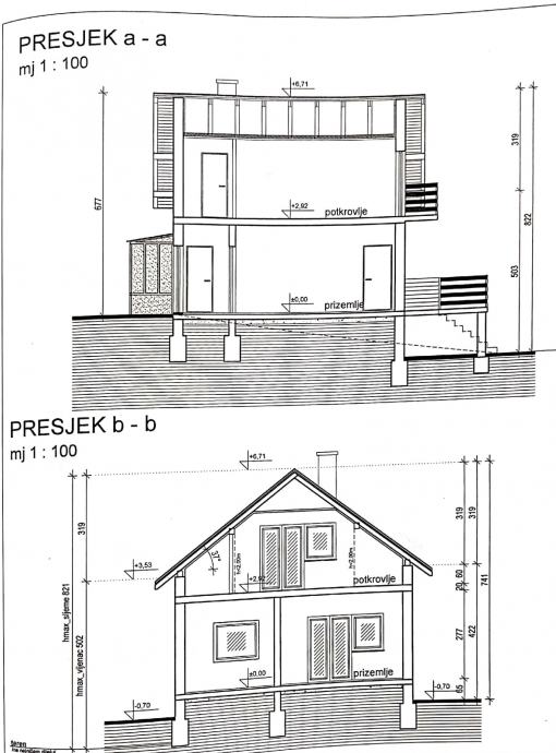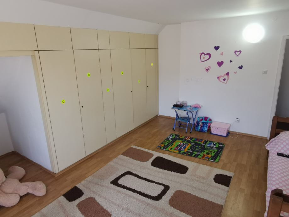 Unutarnjim stubama se iz boravka dolazi na etažu visokog potkrovlja koje je potpuno uređeno i sastoji se od jedne velike sobe i prostranog spremišta. Sve kosine u etaži potkrovlja su kvalitetno riješene ugradbenim ormarima, a krovište je izolirano mineralnom vunom i lesonit pločama.