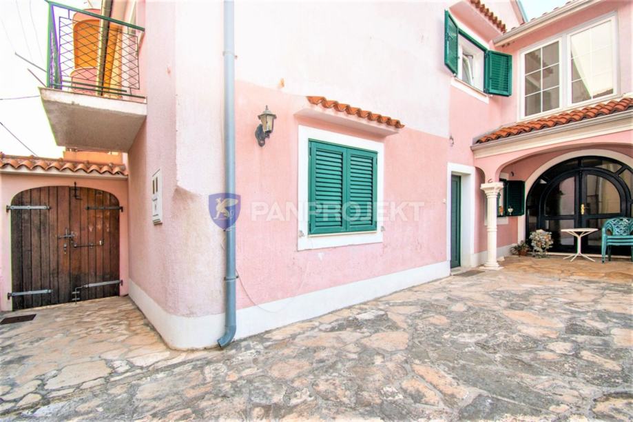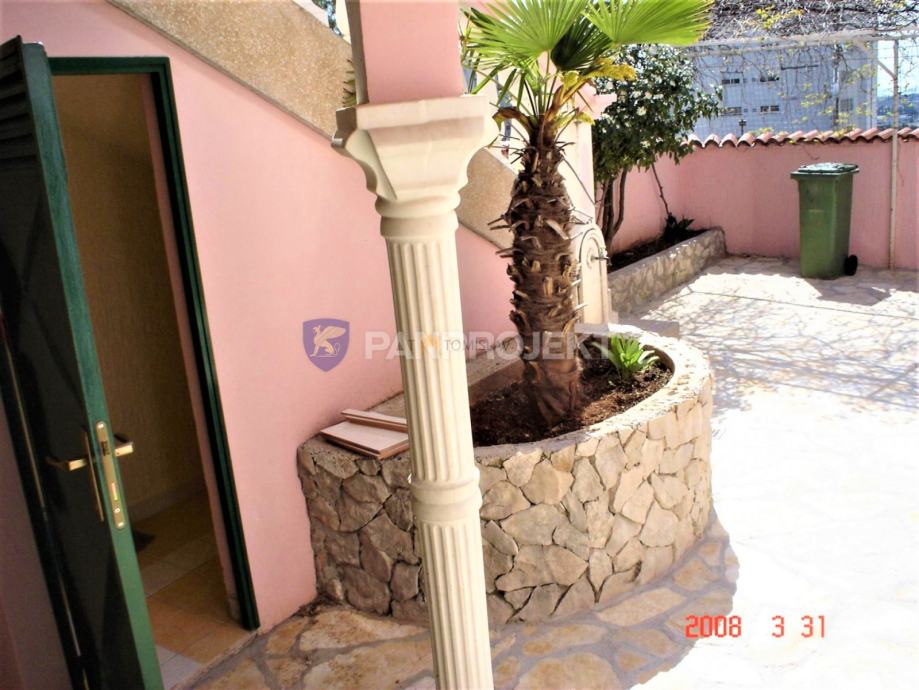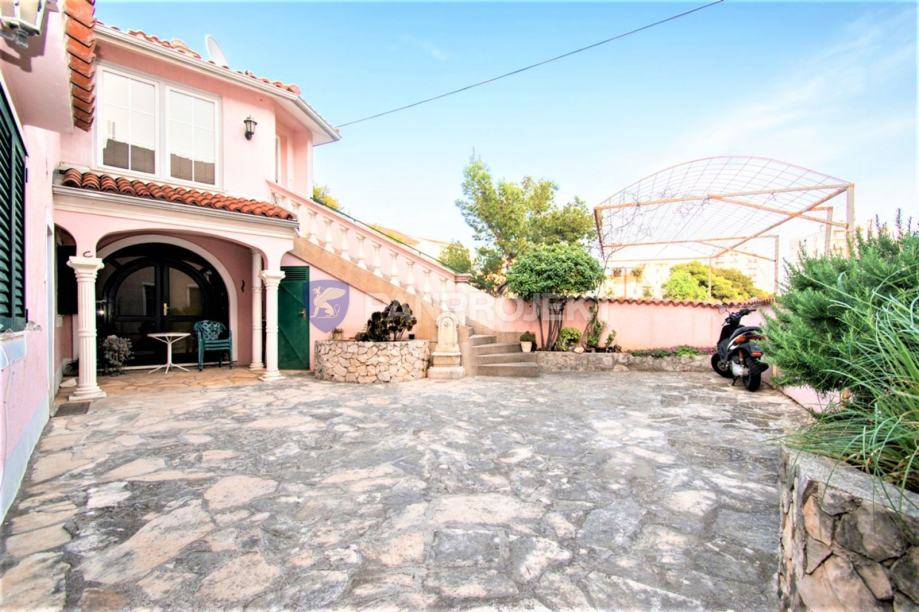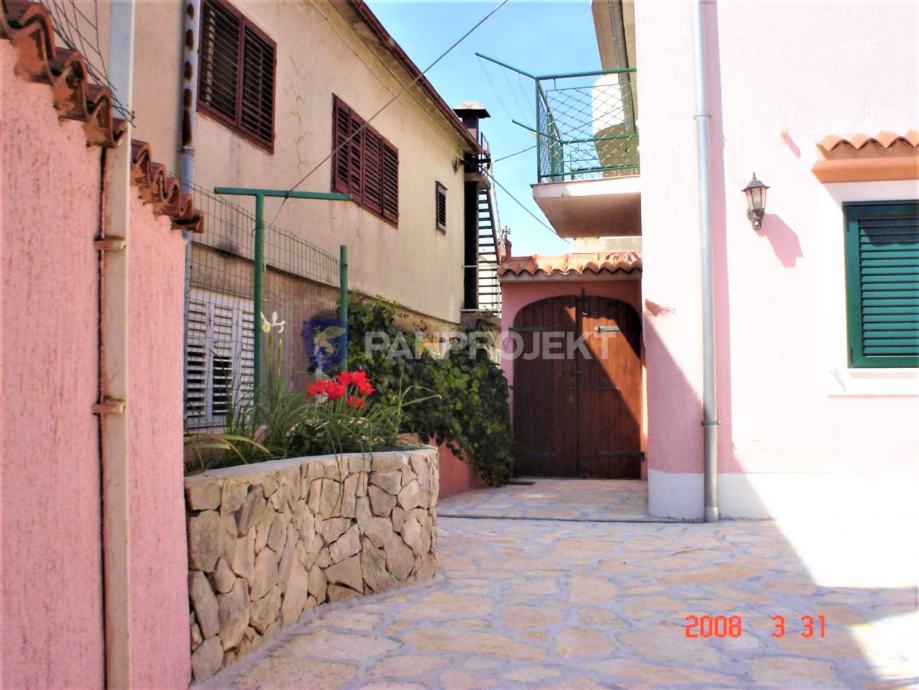 Okućnica od 60 m2 uređena je i popločana kamenim pločama. Parking se nalazi 20 metara dalje u ulici. Kuća ima pogled na more s 1. kata. Kuća je jednim zidom povezana sa susjednom kućom.