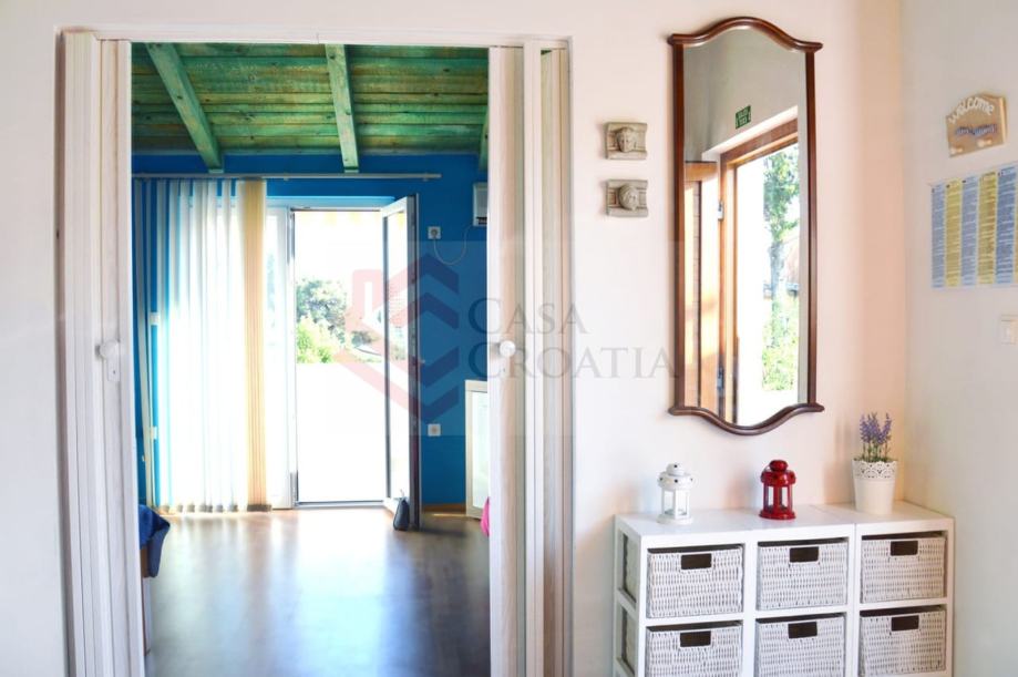 Prizemlje se sastoji od ulaznog hodnika u kojemu je smještena mini kuhinja s hladnjakom i kuhalom, velike sobe ispred koje se nalazi terasa, male spavaće sobe i kupaonice u kojoj je tuš.