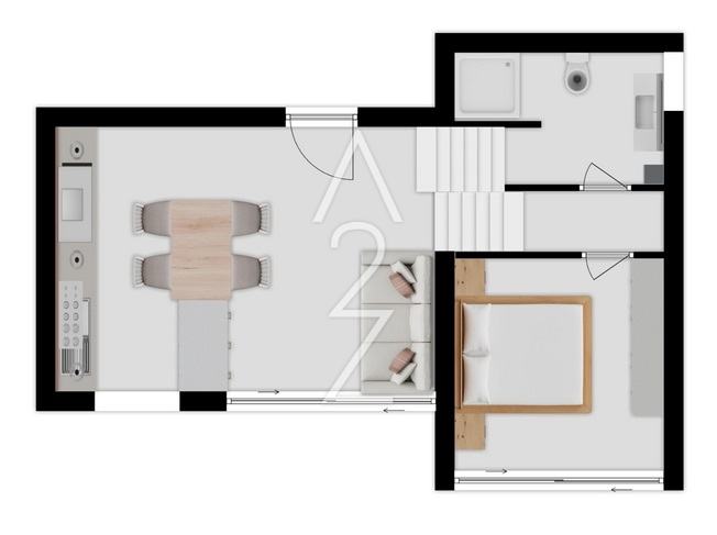 Prva etaža obuhvaća prostranu i svijetlu dnevnu zonu, koja uključuje dnevni boravak skladno povezan s modernom kuhinjom i blagovaonicom. Iz ove otvorene i prozračne prostorije izlazi se na terasu, savršeno mjesto za uživanje u blagim večerima i pogledu na more. Na istoj etaži nalazi se udobna spavaća soba, elegantno uređena kupaonica s toaletom te hodnik koji dodatno doprinosi praktičnosti prostora.