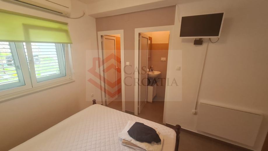 Sastoji se od prizemlja u kojem se nalazi jedan poslovni prostor od cca 12 m² koji je trenutno uređen kao soba s wc-om i sobe od cca 23m² u sklopu koje se nalazi i čajna kuhinja, WC i kupaonica što bi se moglo spojiti u jedan apartman.