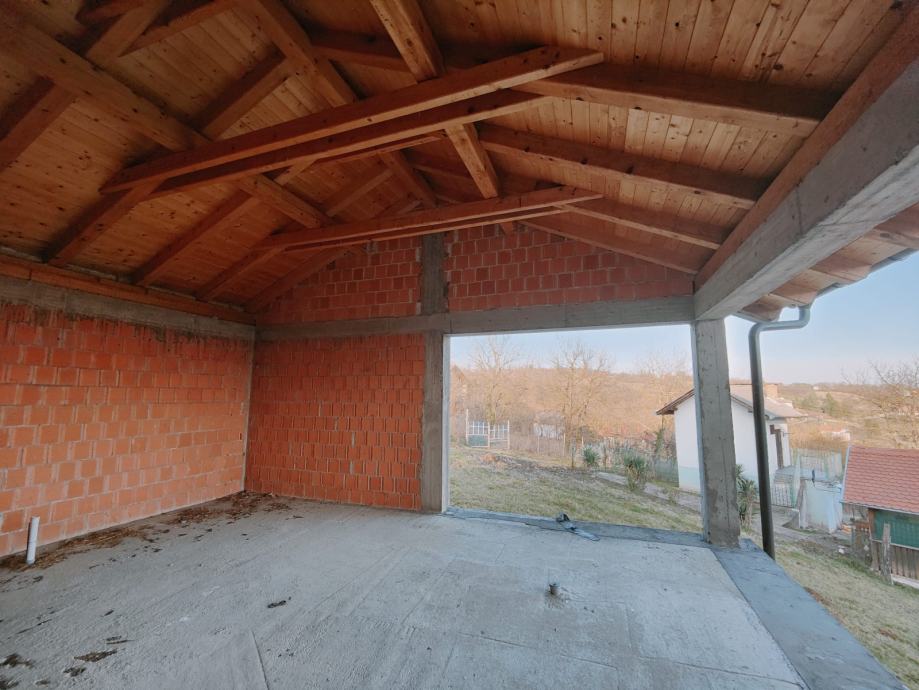 Brodsko Vinogorje, visoka prizemnica modernog stila u roh bau izvedbi, uz asfaltnu cestu, pogled na grad.