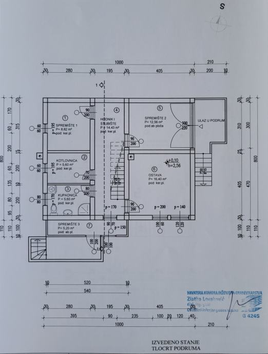 - Podrum se sastoji od ulaznog spremišta, hodnika s kuhinjom, kupaonice s tuš kadom i WC-om, spavaće sobe, blagovaonice i dnevnog boravka, stubišta koje vodi u visoko prizemlje te kotlovnice za pripremu tople sanitarne vode i centralnog grijanja na gradski plin.