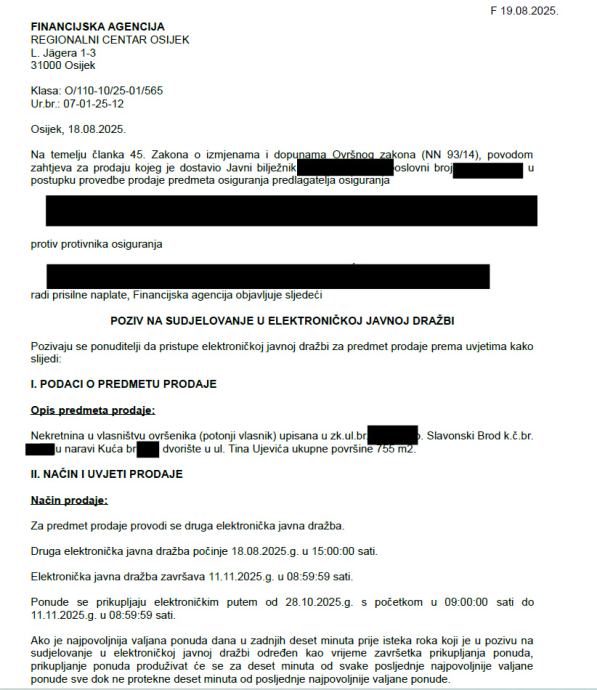 Druga elektronička javna dražba počinje 18.08.2025.g. u 15:00:00 sati.