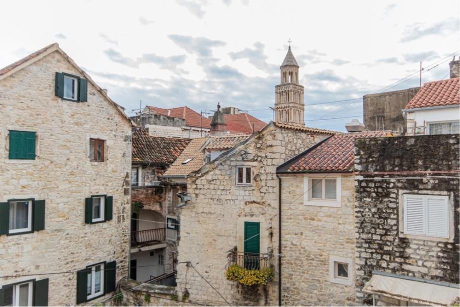 Jedan od unutarnjih zidova čuva izvorni trag prošlih vremena – autentični kameni zid iz 305. godine, svjedok ere cara Dioklecijana. Ova povijesna posebnost čini nekretninu pravim draguljem među splitskim nekretninama. S prozora i terasa pruža se očaravajući pogled na Zvonik sv. Duje, simbol grada koji odiše duhovnošću i impresivnom arhitekturom.
