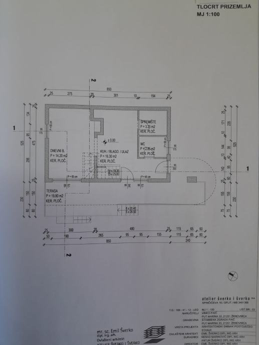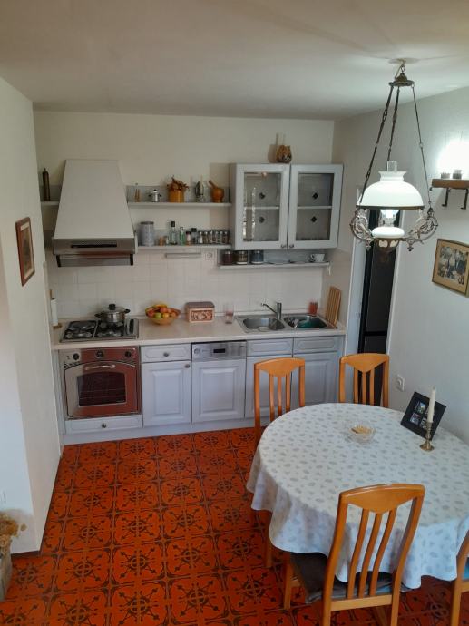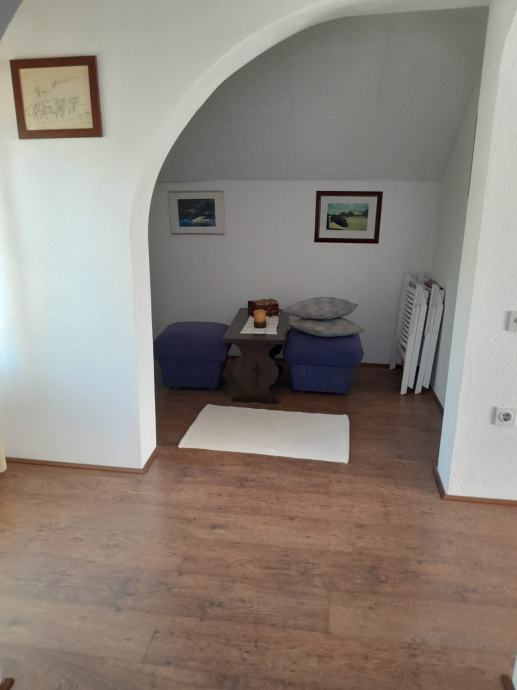 dnevni boravak s kaminom 14,20m2 ostava 3,35m2 i wc 2,85m2.Unutarnjim stepenicama se ide na prvi kat