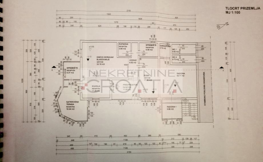 - natkrivena terasa, predprosto sa hodnikom, kuhinja, dnevni boravak sa blagovaonicom, 2 spremišta, kupaonica i soba