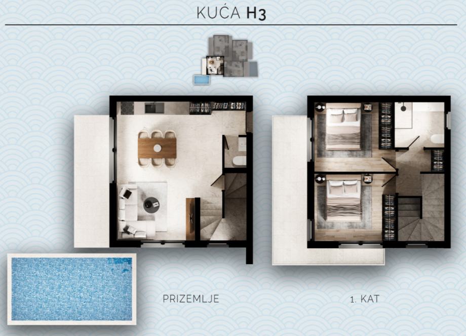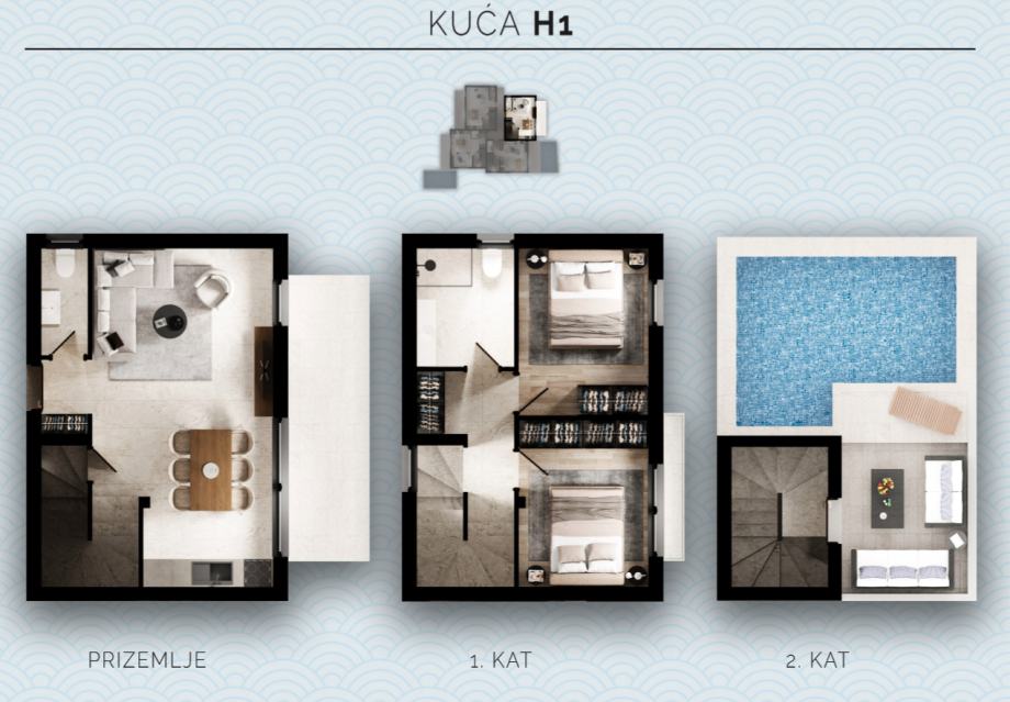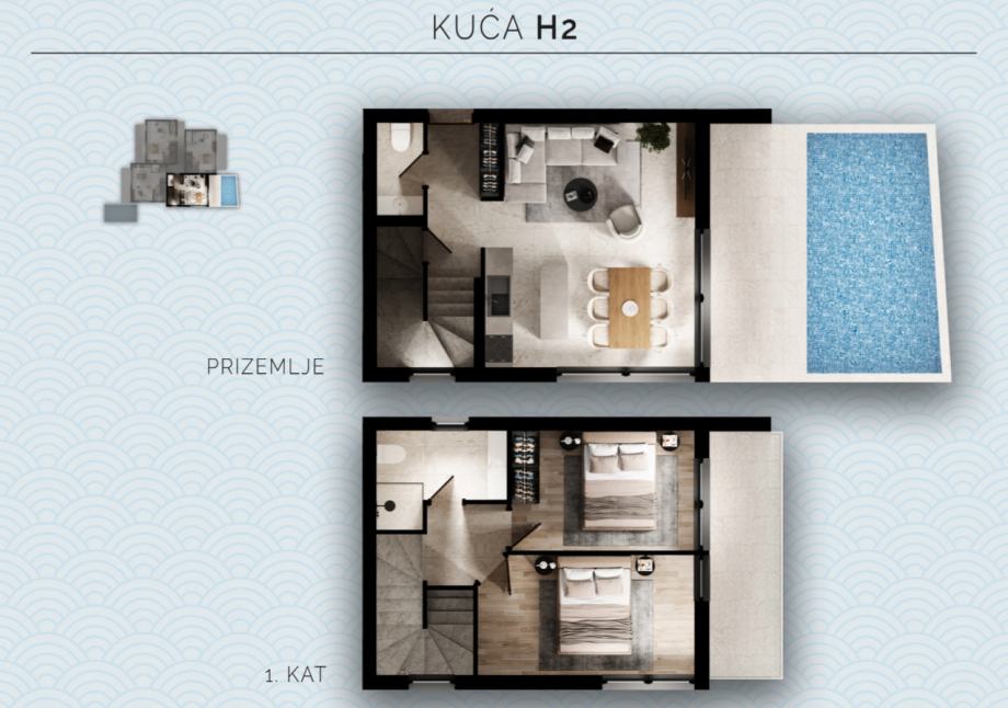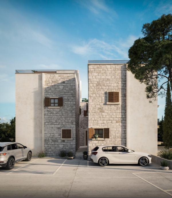 Moderno dizajnirane, savršeno se uklapaju u mediteranski ambijent, pružajući iznimnu udobnost i luksuz. Svaka dvoetažna kuća ima vlastiti ulaz,